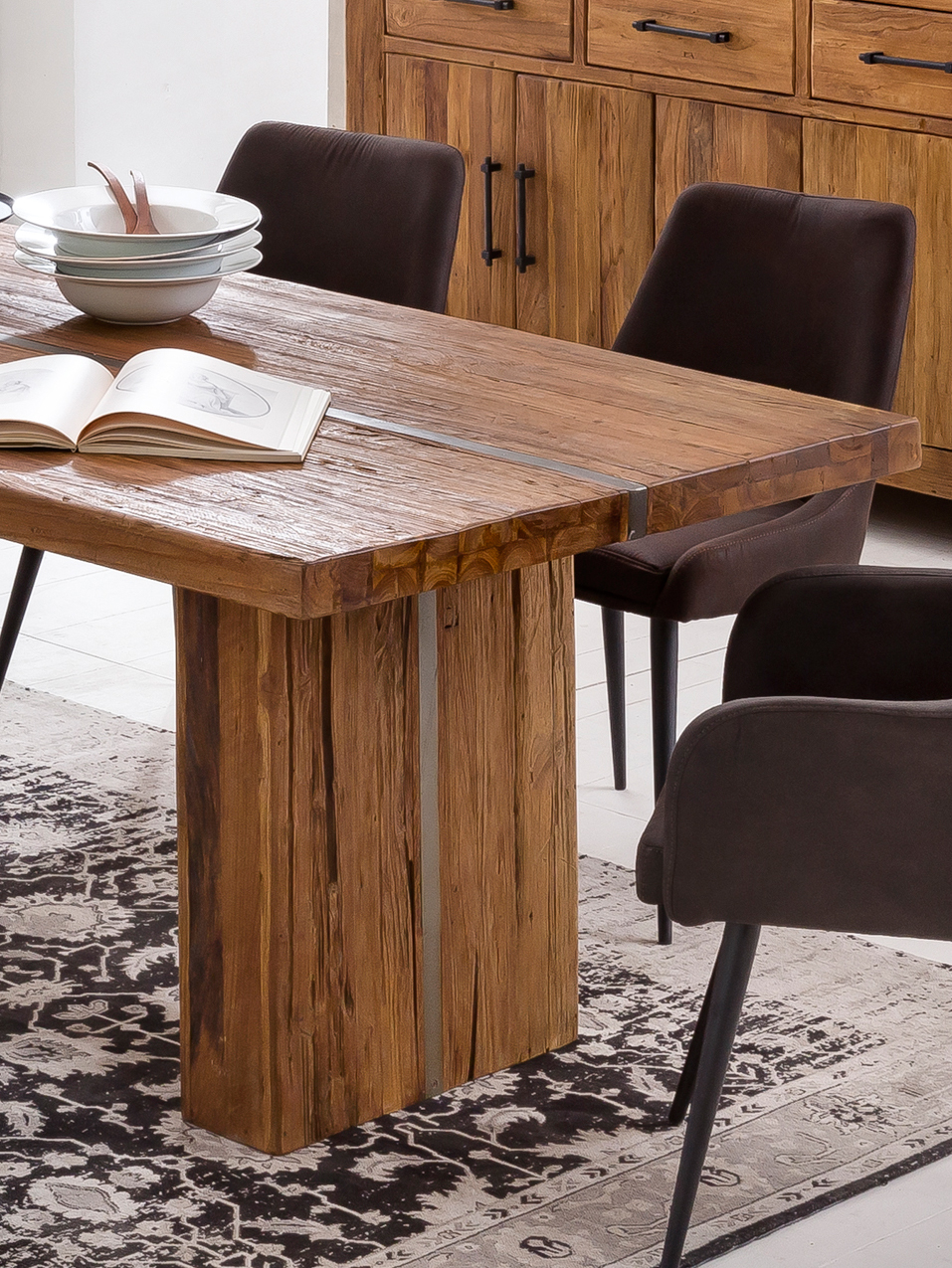 Das wettergegerbte Teakholz stammt von alten Häusern, Scheunen, Reiströgen und anderen selbstverständlichen Alltagsgegenständen in Indonesien. Es findet so nun eine sinnvolle Weiterverwendung als liebevoll gefertigtes Möbelstück und schont so auch die Umwelt. Die kubische Form dieses imposanten Tisches ist auch in 20 Jahren noch modern, während der natürliche Farbton und die gebürstete Oberfläche einen Charme ausstrahlen, den man mit Neuholz einfach nicht erreicht. Jedes Teil hat sein eigenes Gesicht und sticht aus der Normalität des Alltags hervor.