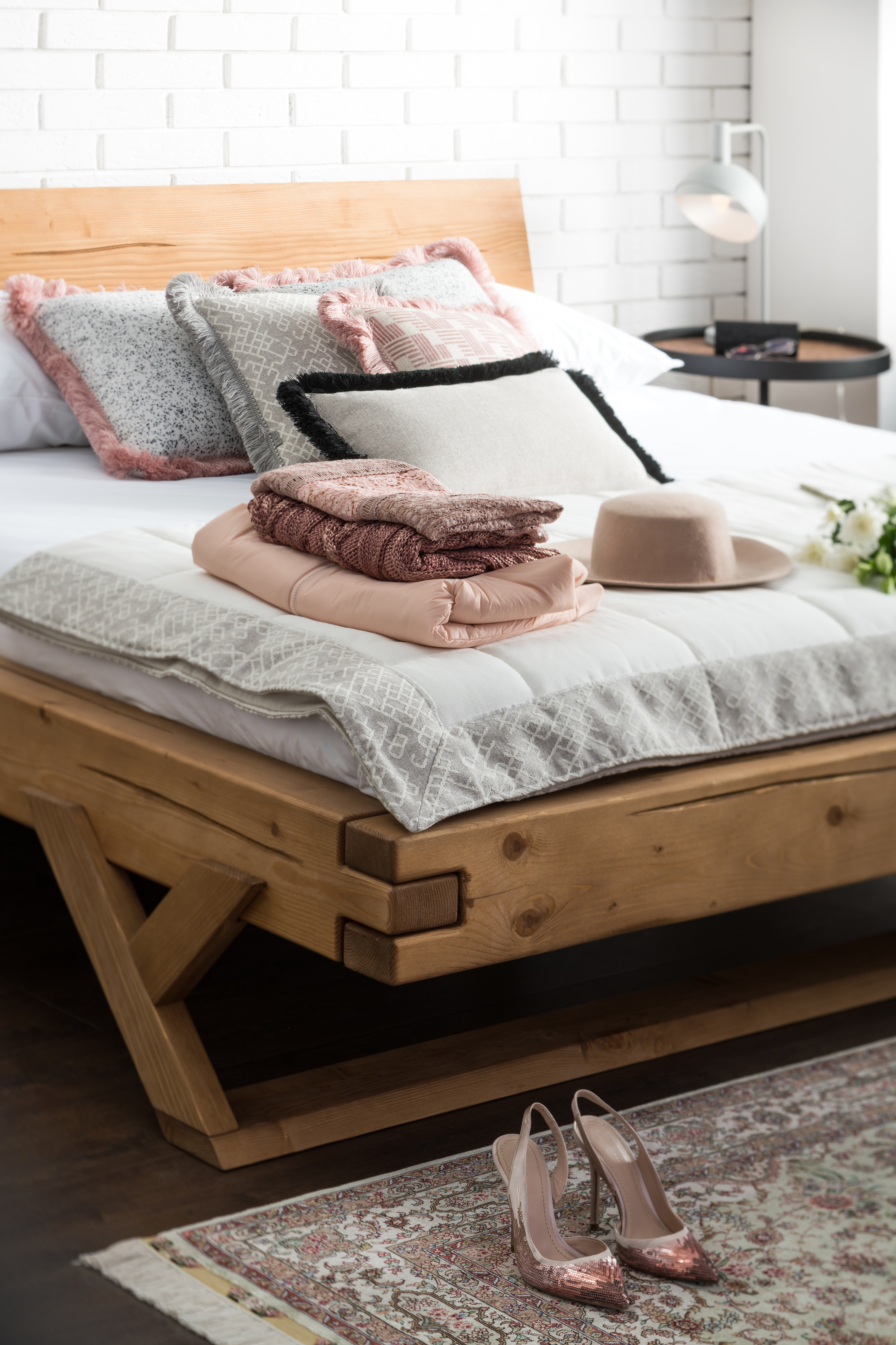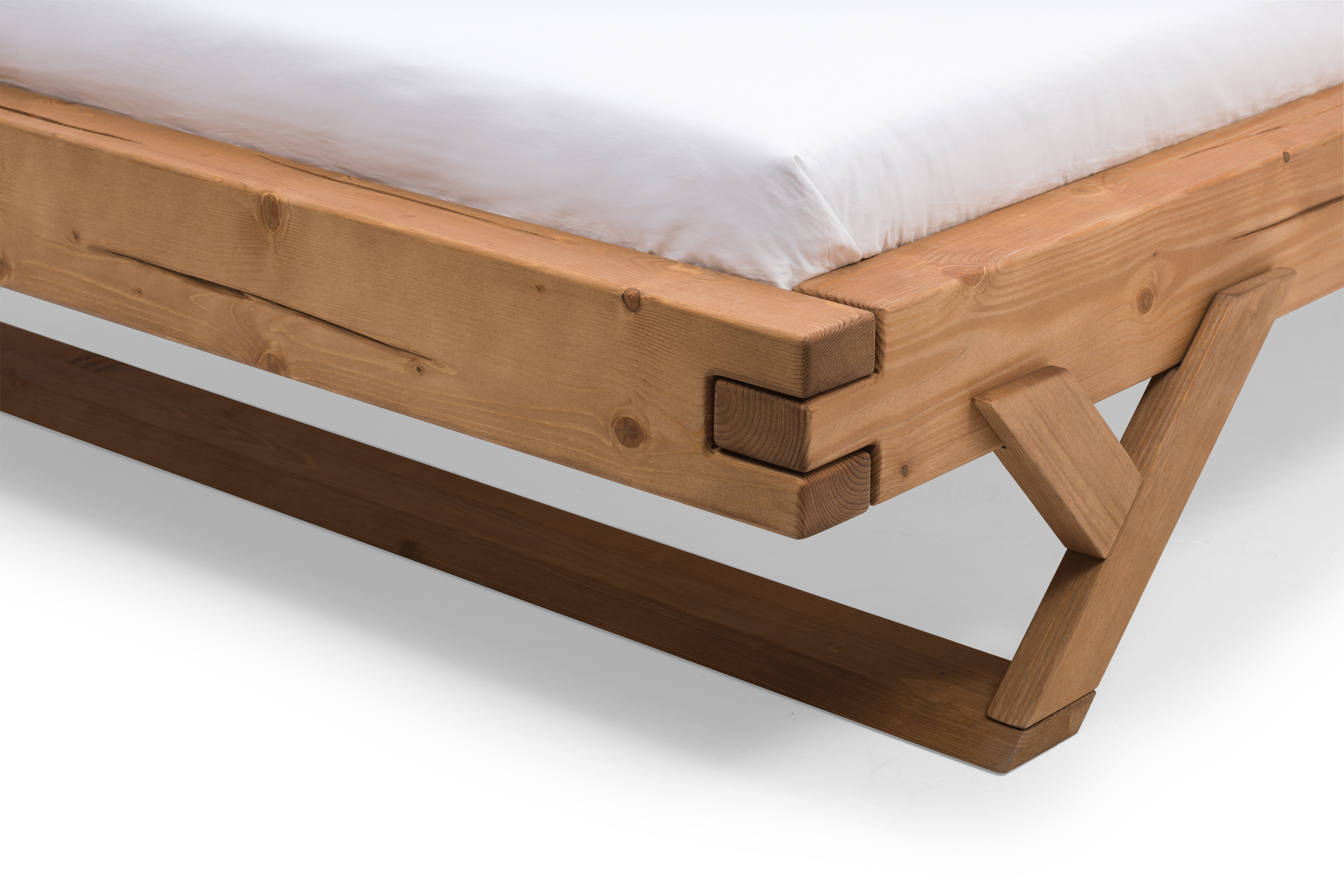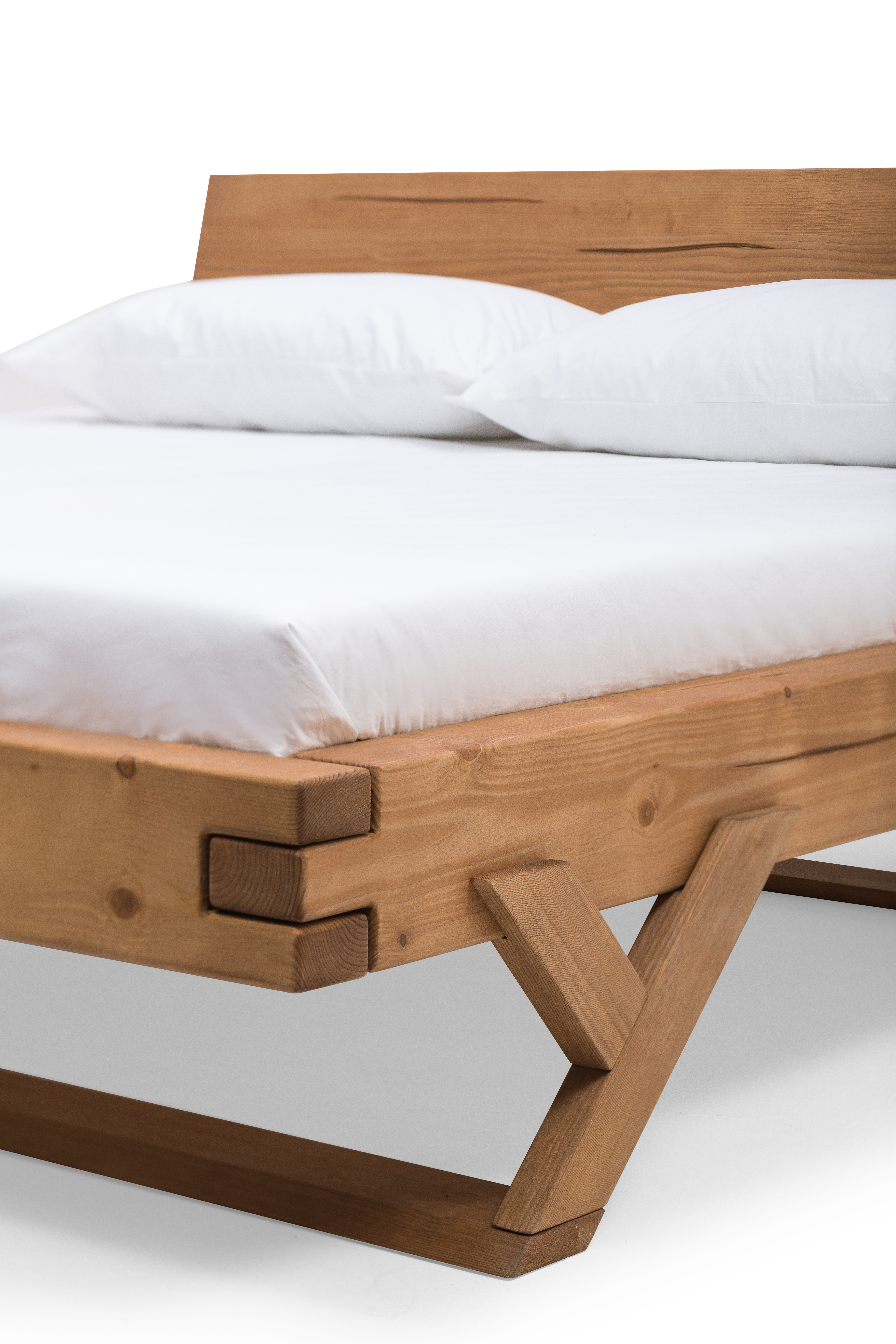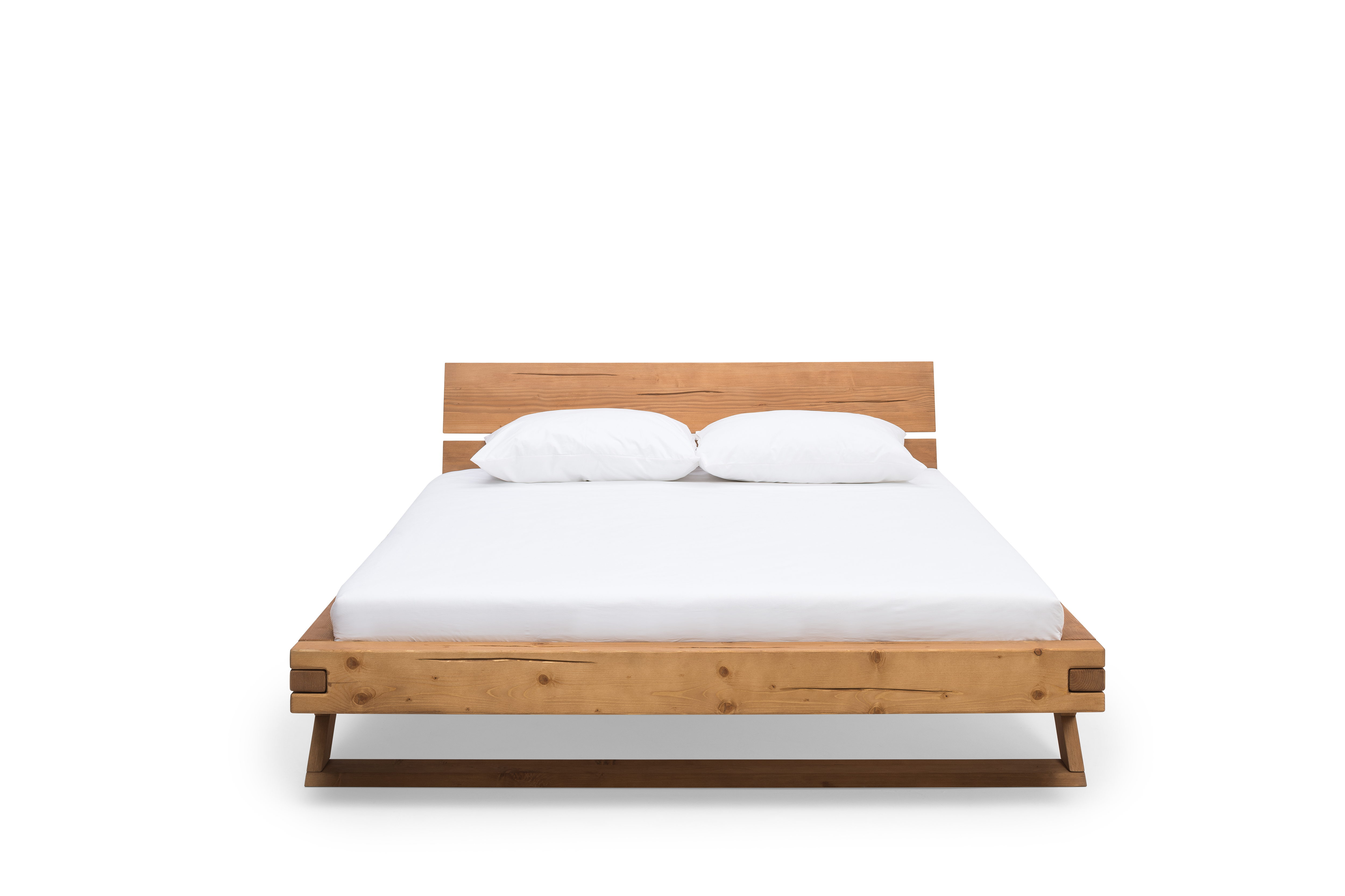 Mit diesem rustikalen Balkenbett aus hochwertigem Massivholz zieht urige Gemütlichkeit in das heimische Schlafzimmer ein. Das robuste Bettgestell aus massivem Fichtenholz bringt eine geballte Ladung Natur nach Hause und sorgt für Stabilität und Langlebigkeit. Fichtenholz ist dank seiner lebhaften Struktur eine beliebte Wahl für Massivholzmöbel €“ Wuchsrisse und Astlöcher im Holz machen das Bett zum faszinierenden Einzelstück mit markanter Ausstrahlung. Ein besonderer Hingucker bei diesem Balkenbett sind die charakteristischen Eckverbindungen. Diese unterstreichen nicht nur die solide Optik des Bettes, sie sorgen auch für höchste Belastbarkeit. Für einen modernen Twist sorgt das Gestell mit Y-Beinen und die abgeschrägten Holzkufen. Der massive Look des Holzbettes wird zudem durch das geteilte Kopfteil aufgelockert. Das solide Bett vereint auf charmante Weise den modernen Stil und traditionelle Fertigungsweise in einem langlebigen Möbelstück. Mit diesem Balkenbett zieht ein besonders pflegeleichtes Möbelstück in die eigenen vier Wände. Die geölte Oberfläche ist sehr pflegeleicht, strapazierfähig und schützt das Holz vor Staub und Verschmutzungen. Kleinere Verschmutzungen mit einem angefeuchteten Tuch abwischen.