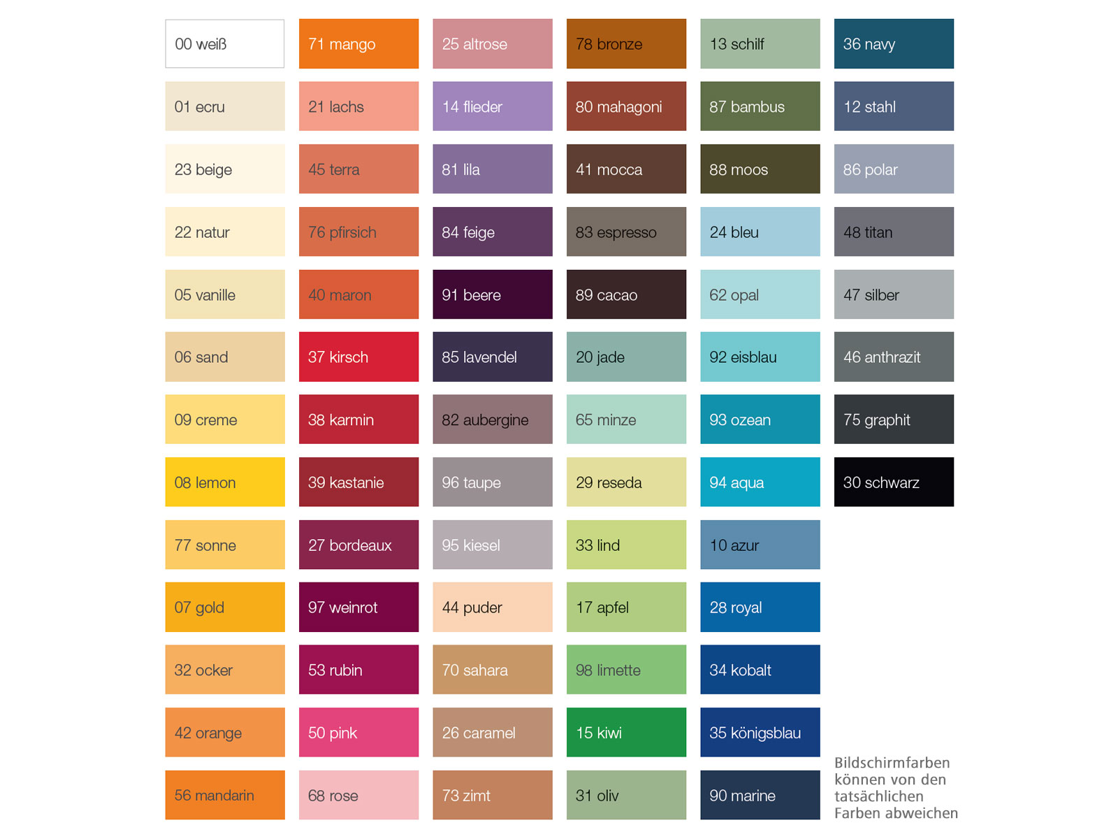 | Farbe: | Beige, Blau, Braun, Gelb, Grau, Grün, Orange, Pink, Rosa, Rot, Schwarz, Weiß |