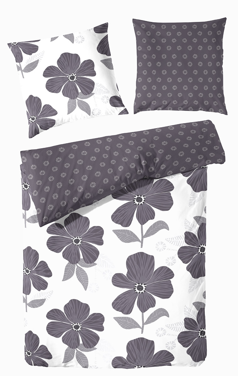 - Moderne Renforcé Wendebettwäsche mit großflächigen Blüten auf weißem Grund auf der Vorderseite und kleinen Blüten auf dunklem Grund auf der Rückseite
