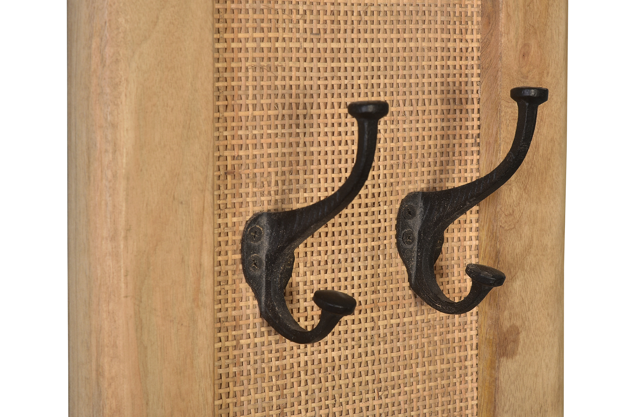 Werten Sie Ihren Dielenbereich mit diesem Garderobenpaneel aus naturfarbigem Mangoholz mit luftigem Rattan auf. Das Garderobenpaneel ist dank seiner Kombinationsmöglichkeit mit schon vorhandenem Mobiliar vielseitig einsetzbar, so ist es gerade für den angesagten Industrial Look wie gemacht, aber auch mit Landhausmöbeln oder skandinavischem Design lässt es sich problemlos kombinieren. An 4 Doppel-Haken bietet es Platz für Jacken, Mäntel oder Taschen, dabei sorgte es durch seine Optik mit dem modernen Materialmix für eine wohnliche Atmosphäre in Ihrer Diele.