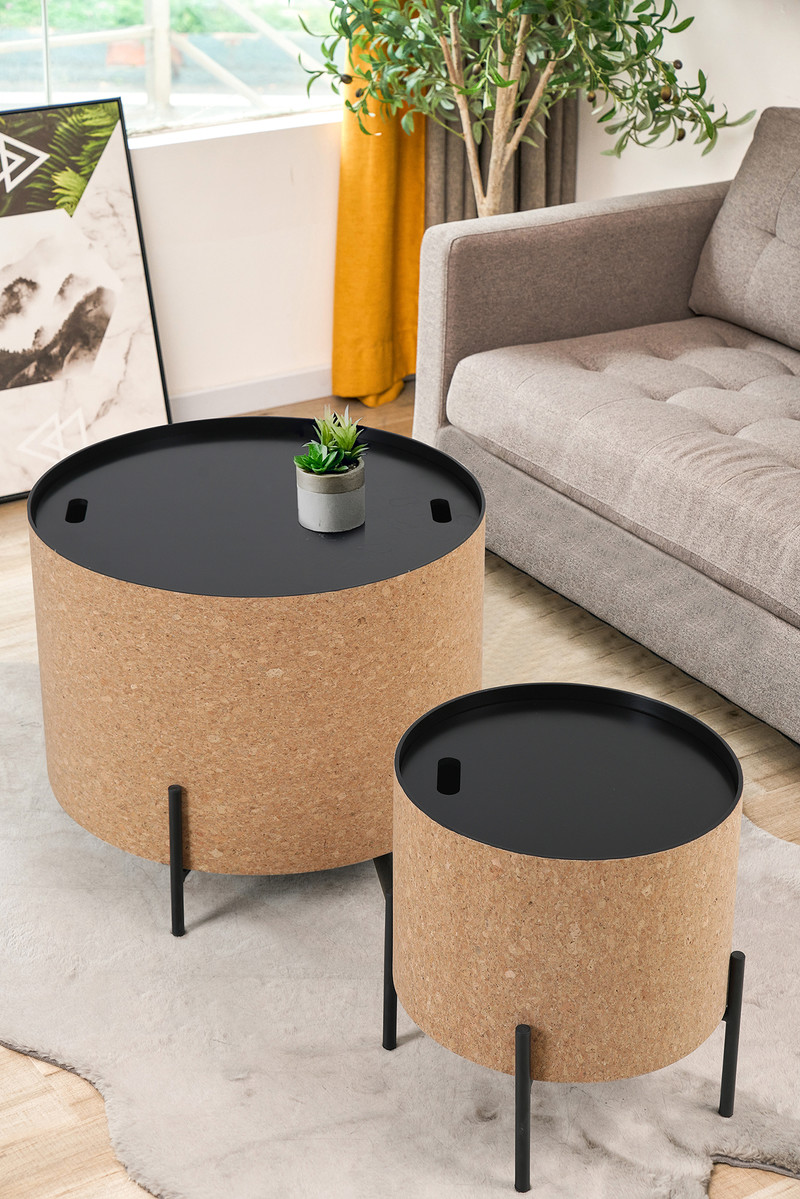 Möbel aus Kork sind nicht nur ein außergewöhnlicher Design-Hingucker, sie sind durch die positiven Eigenschaften des Naturmaterials auch sehr praktisch. Die robuste Korkoberfläche strotz den Strapazen des Alltags, durch das leichte Gewicht sind die Couchtische zusätzlich im Handumdrehen umplatziert – Immer genau dort bereit, wo gerade zusätzliche Ablagefläche benötigt wird. Die Tische kommen im praktischen 2er Set mit unterschiedlichen Grüßen und Höhen, so dass sie optimal nebeneinander platziert werden können, für ein harmonisches Gesamtbild. Der Kontrast mit den schwarzen Metallbeinen sorgt für eine coole und moderne Optik, welche das extravagante Design gekonnt abrundet. Besonderer Clou: Die abnehmbaren Tischplatten bieten cleveren Stauraum im Inneren der Tische.