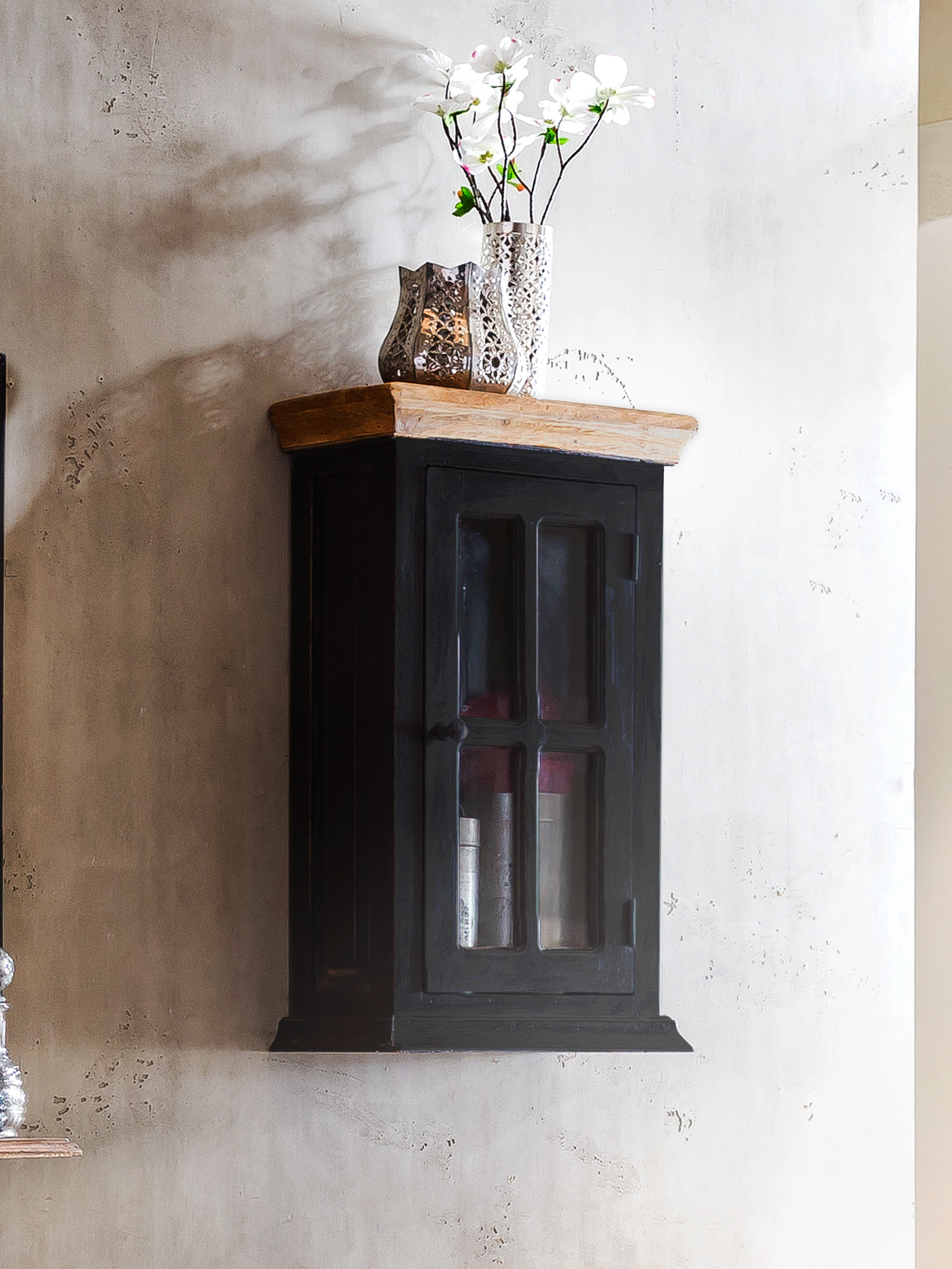 Mit diesem wirklich gelungenen Hängeschrank, ob an großen Wandflächen oder kleineren Wandnischen, geben Sie Ihrem Badezimmer einen Hauch von Urlaub. Der Stauraum in dem Regal bietet genügend Platz für vielerlei Kosmetika, aber auch für Dekoartikel oder Mitbringsel aus den Ferien, welche durch die Glastür gut sichtbar sind. Die Hängevitrine ist ein absoluter Blickfang und schmückt jedes Bad. Die honigfarbene Deckplatte eignet sich ebenfalls für Accessoires oder Zimmerpflanzen. Wer die Antike mag, wird dieses Möbel in seinem dunklen Holz mit all seinen Spuren lieben, denn dieses Schränkchen ist auch mit modernem Mobiliar kombinierbar und verliert dabei seinen einzigartigen Charme nicht.