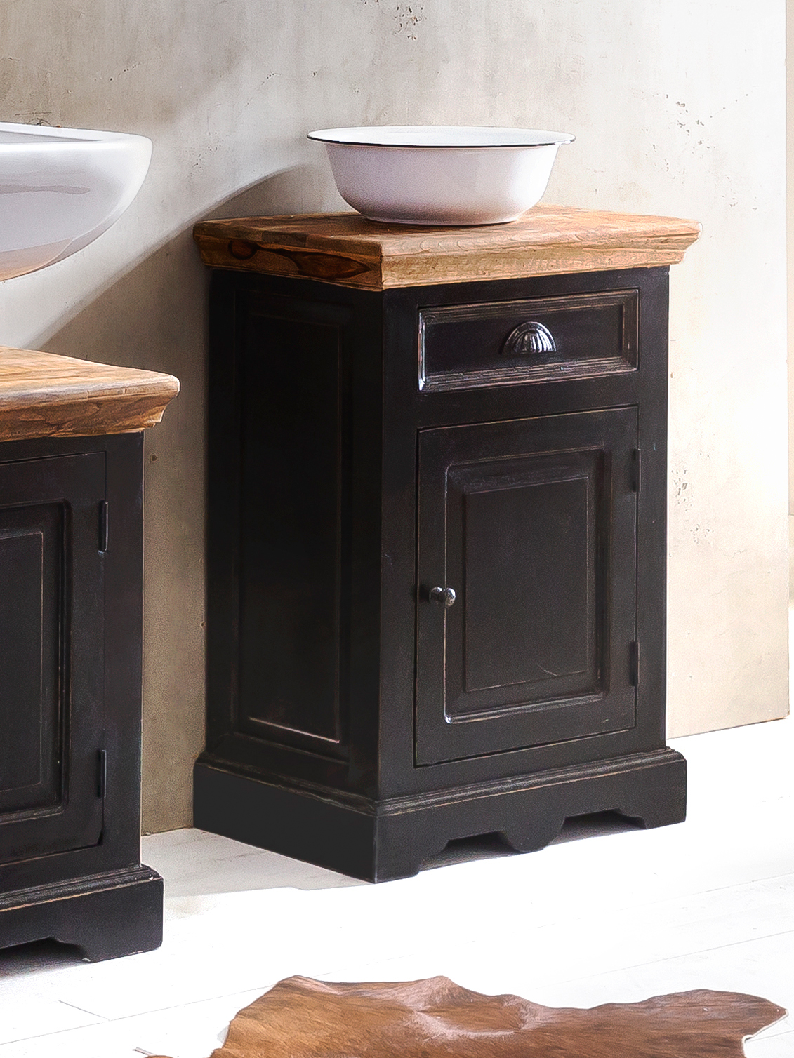 Dieser Badschrank wirkt in jedem Badezimmer sehr edel. Ausgestattet mit 1 Tür und einem Schubkasten bietet der Schrank ausreichend Stauraum für Kosmetika, Handtücher und weitere Accessoires. Die honigfarbene Deckplatte des Badezimmerschranks lädt zum Dekorieren ein oder - je nach Platzanspruch - auch als weitere Ablagefläche. Die Neutralität seiner Erscheinung lässt es zu, dass man ihn durchaus auch als kleinen Dielenschrank oder Garderobenschrank oder sogar als Nachtkommode verwenden kann. Hier sind der Fantasie keine Grenzen gesetzt, denn das schwarze Holz aus Mango lässt sich hervorragend mit modernen Möbeln kombinieren.