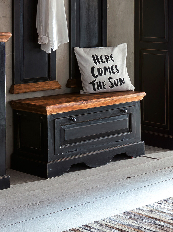 Dieser 2-farbig antik gestaltete Schuhschrank sorgt für Ordnung im Leben Ihrer Schuhe. Die mit 2 Ringgriffen versehene Klappe lässt sich auch von Kindern einfach öffnen, welche die Schuhkommode auch gerne als Sitzbank während des Anziehens der Schuhe nutzen können. Wird die Dielenkommode nicht als Sitzmöglichkeit genutzt, lässt sich die Deckplatte sich auch wunderbar dekorieren. Hinter der Klapptür findet sich auf 2 Ebenen genügend Raum für Sportschuhe, Sandalen, Slipper, Sneaker, Kinderschuhe usw. In jeder Diele und jedem Flur kommt das gewollt rustikal, antike Flair besonders zur Geltung.