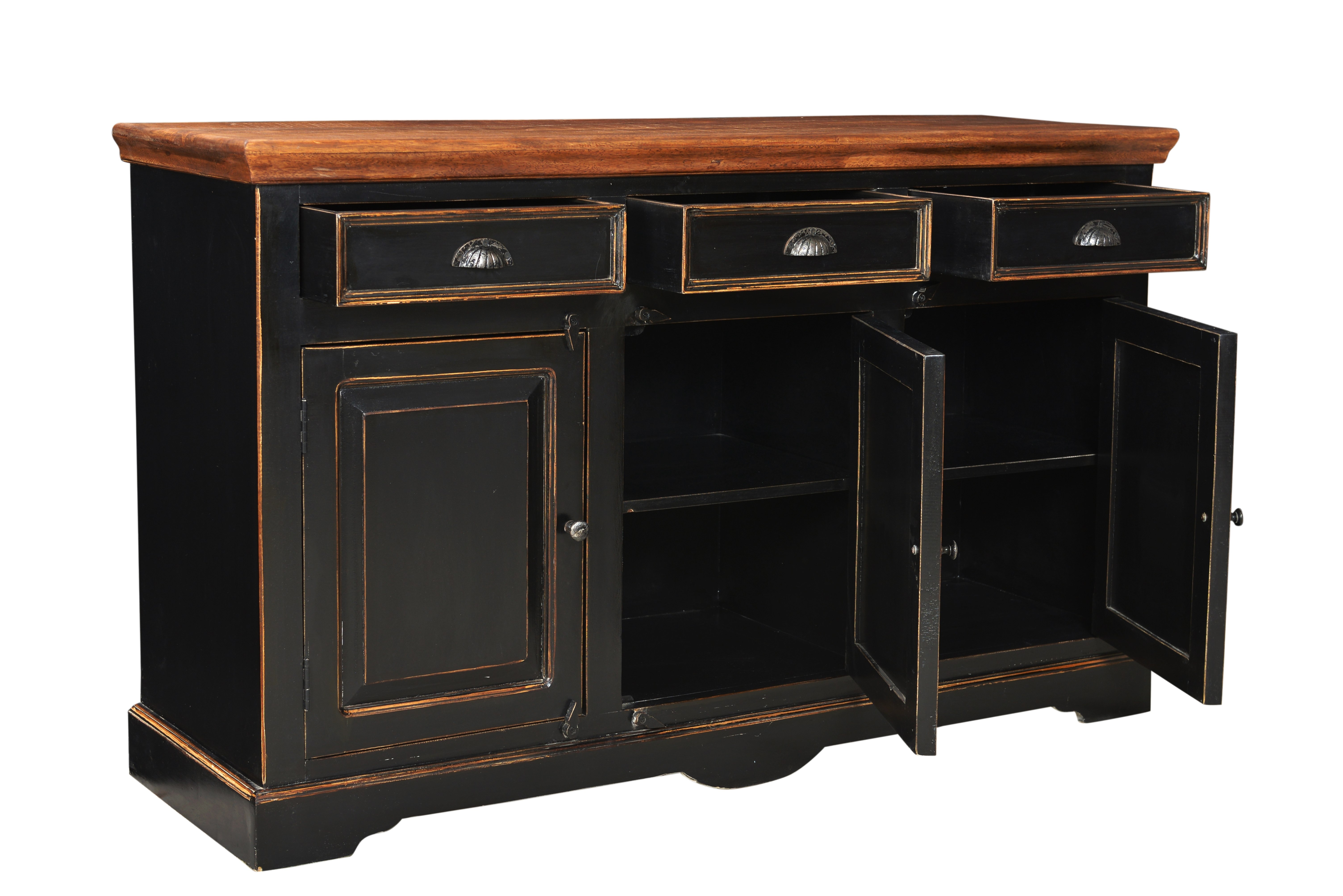 Holen Sie sich mit diesem Sideboard einen Hauch Urlaub direkt in Ihr Zuhause. In dieser Anrichte befindet sich genügend Stauraum hinter 3 Türen und in 3 Schubkästen für vielerlei Dinge. Die honigfarbene Deckplatte eignet sich auch für größere Vasen und lässt die Schönheit des antik anmutenden Buffets erst zur Geltung kommen. Gewollte Gebrauchsspuren geben dem fast schwarzen Holz einen zusätzlichen Reiz. Die Kommode kann sowohl in einem Wohnraum als auch in einer Diele ihren Charme zum Ausdruck bringen.