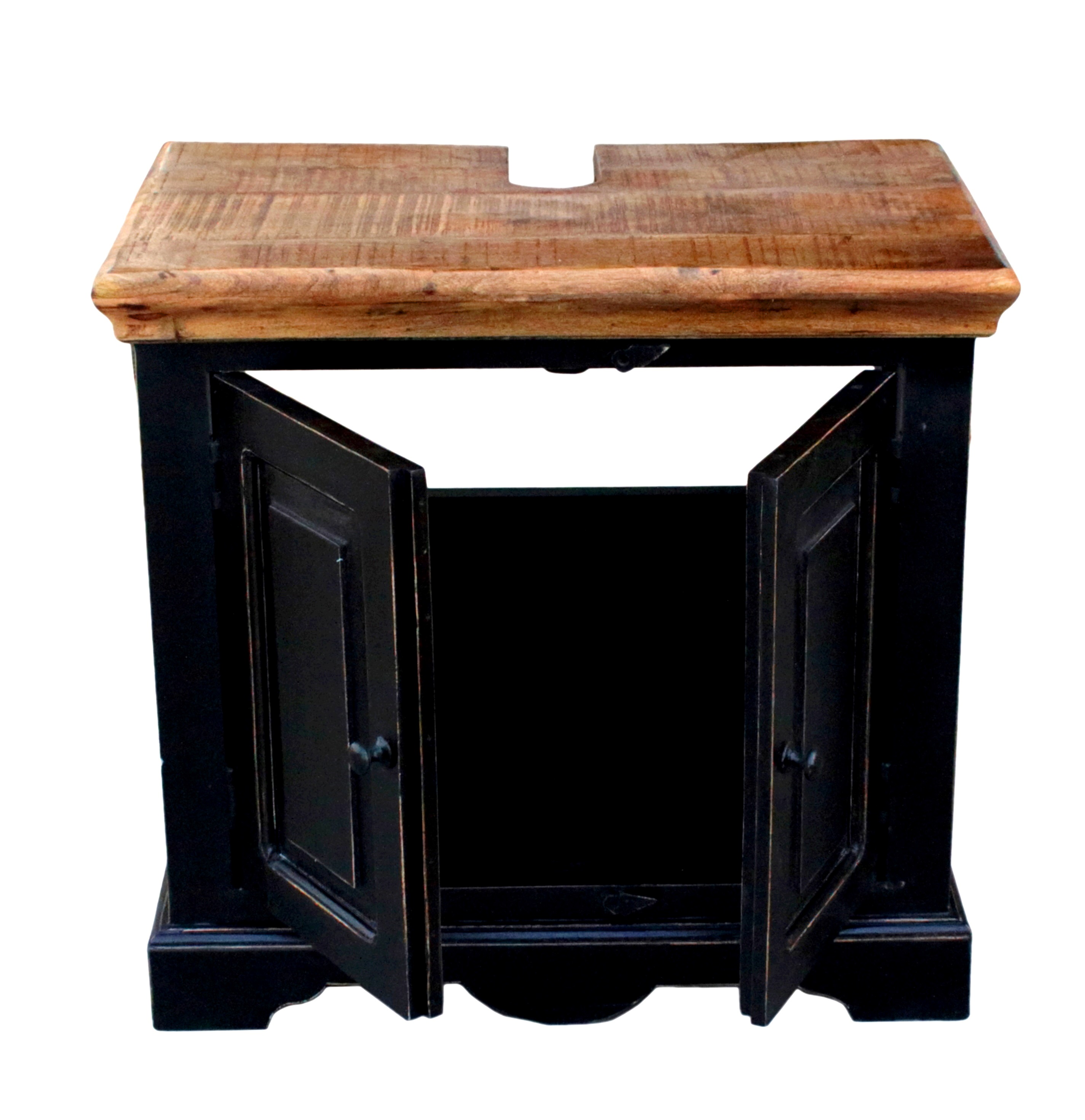 Dieser Waschbeckenunterschrank wirkt in jedem Badezimmer sehr edel. Die honigfarbene Deckplatte wurde mit der nötigen Aussparung für den Abfluss des Waschbeckens versehen. Die Rückwand des Schranks ist ebenfalls nur halbhoch gehalten. Im Inneren des Beckenschranks findet sich hinter den 2 Drehtüren aus schwarzen Mango-Holz genügend Stauraum für Badreiniger, Putzutensilien, WC-Reiniger usw. Mit modernen Badmöbeln ist dieser Badschrank problemlos kombinierbar. Mit gewollt rustikalen Spuren und antikem Flair kann man sich mit diesem Waschtischunterschrank ein Stückchen Corsica in sein Badezimmer holen.