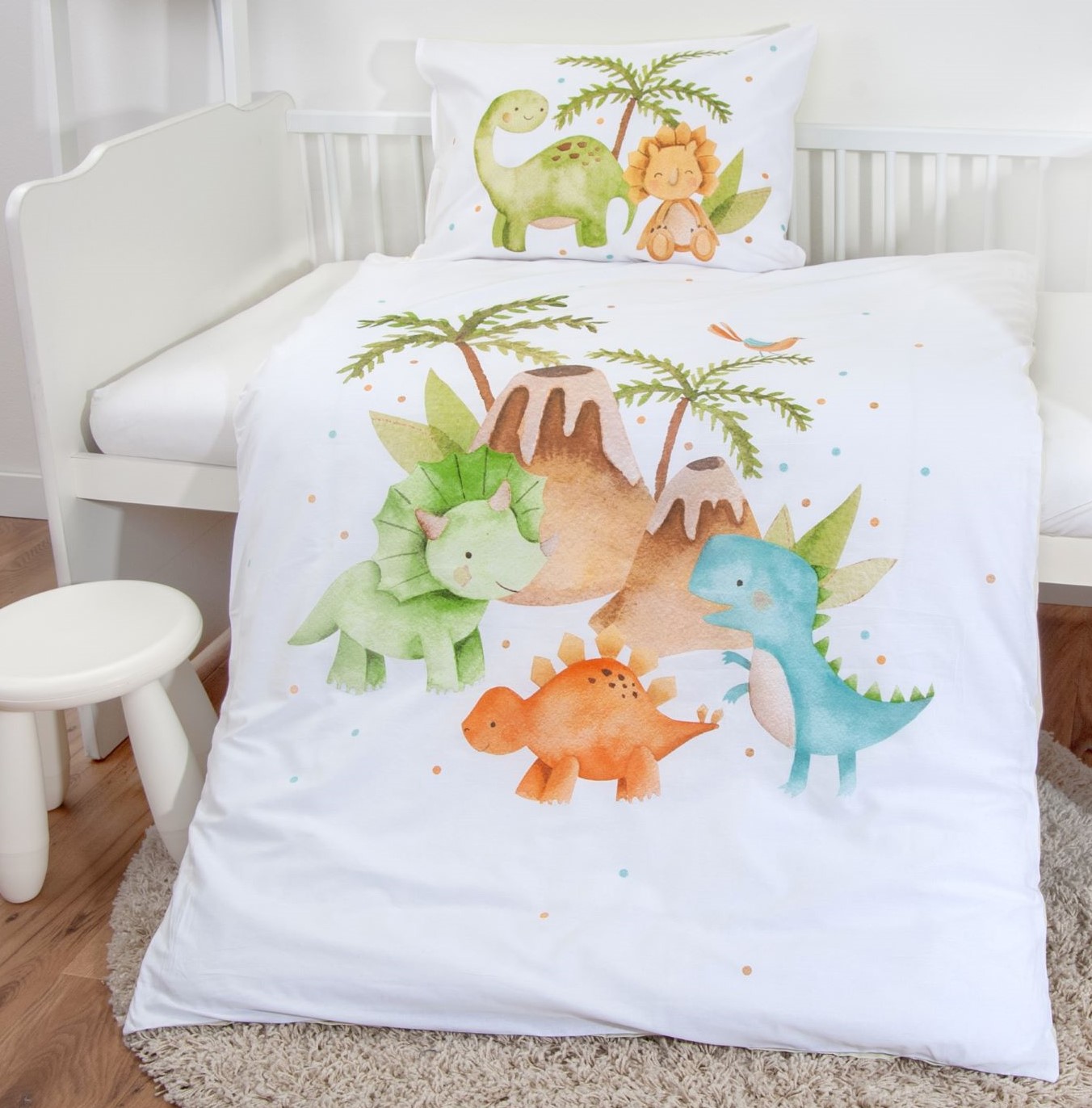 - Diese süßen Dinos werden mit Sicherheit beste Freunde Ihres Kindes: Wendebettwäsche mit niedlichen Dinos, Palmen und Vulanen in tollen Farben auf weißem Hintergrund