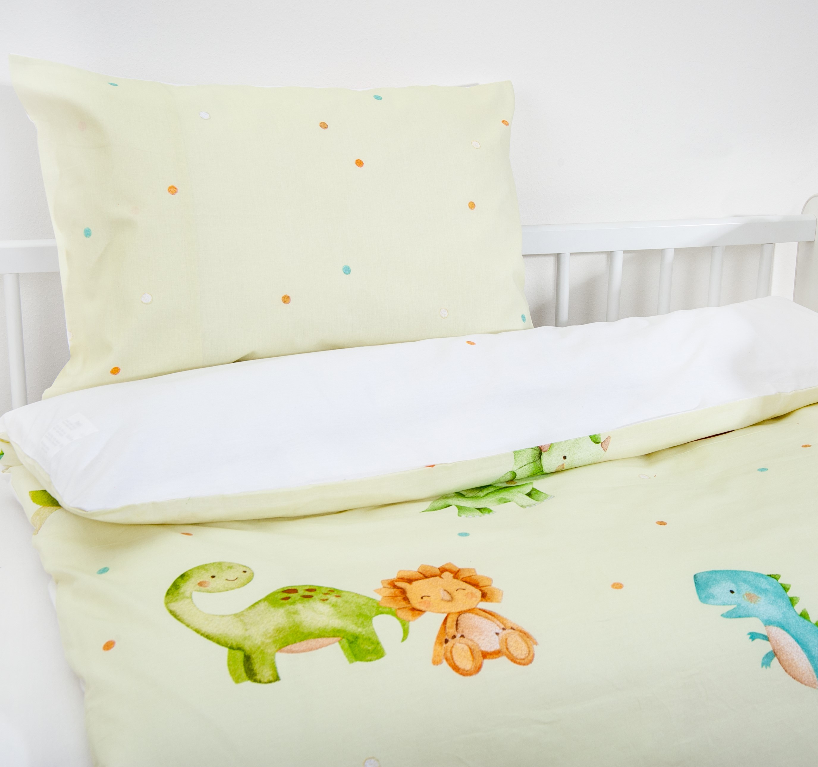 - Diese süßen Dinos werden mit Sicherheit beste Freunde Ihres Kindes: Wendebettwäsche mit niedlichen Dinos, Palmen und Vulanen in tollen Farben auf weißem Hintergrund