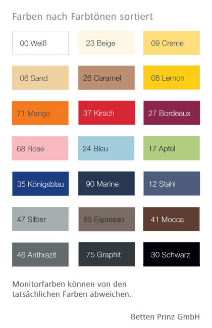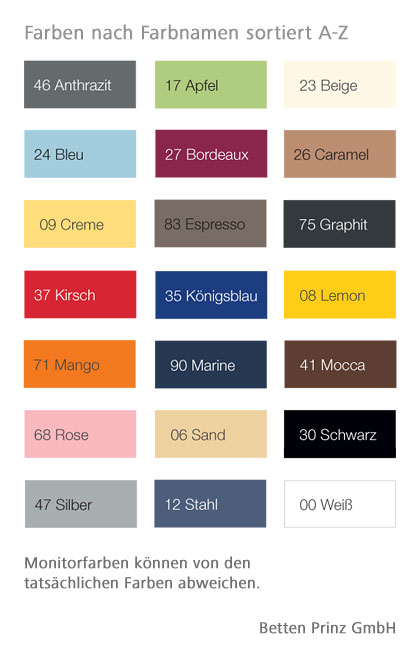 Farbe: Beige, Blau, Braun, Gelb, Grau, Grün, Orange, Rosa, Rot, Schwarz, Weiß