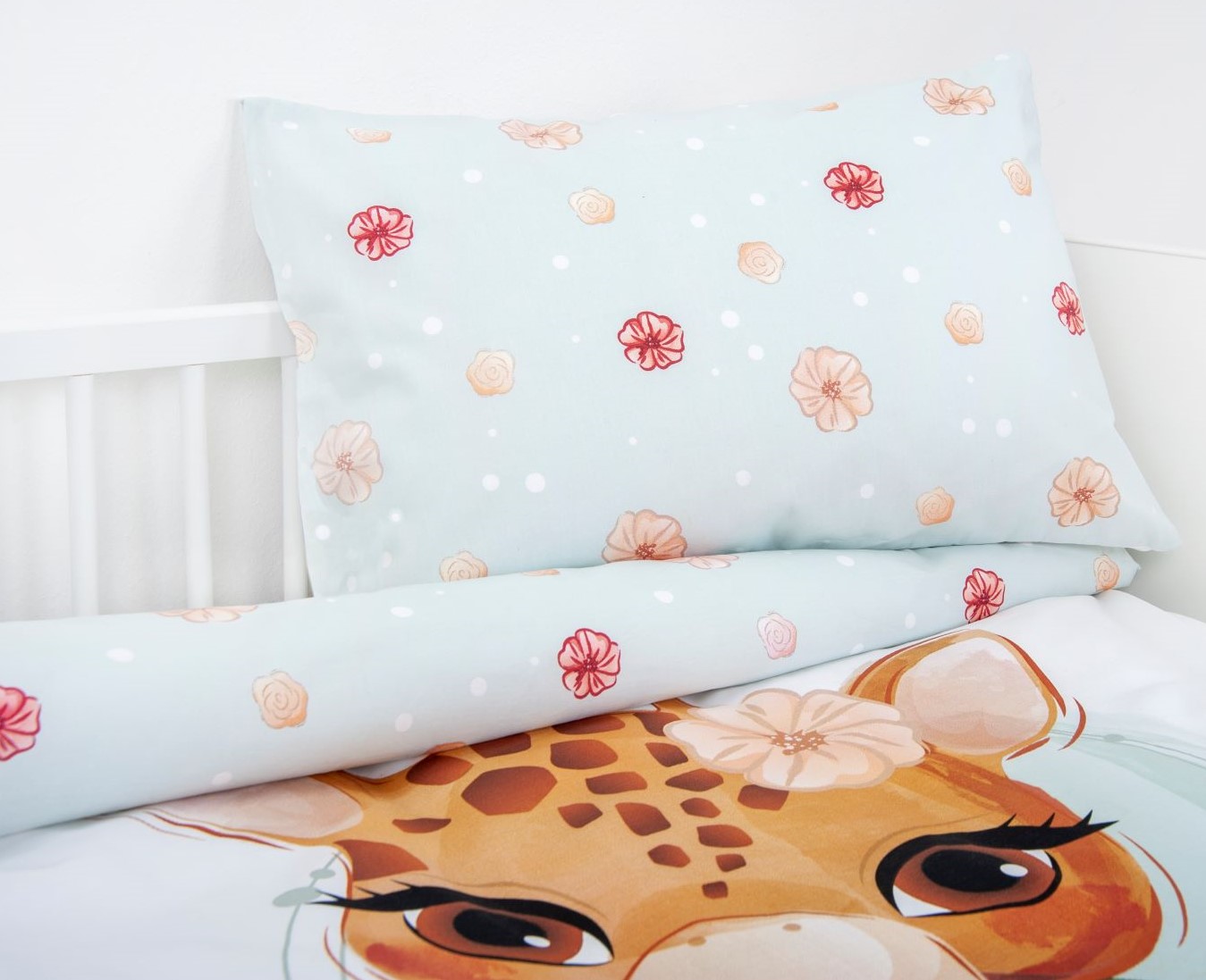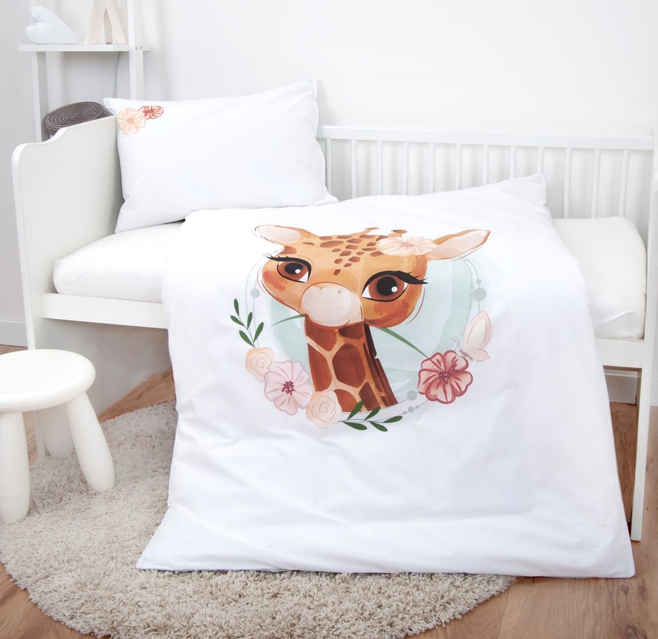 - Ist sie nicht süß? Liebevoll gestaltete Kinder-Wendebettwäsche mit niedlichem Giraffen-Motiv und Blümchen auf weißem Hintergrund