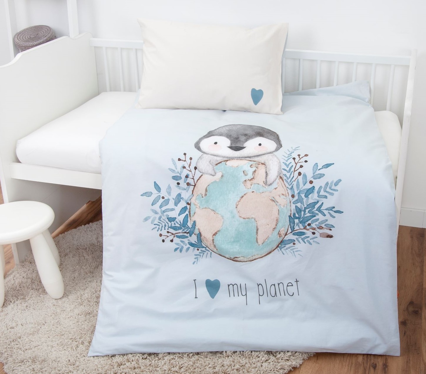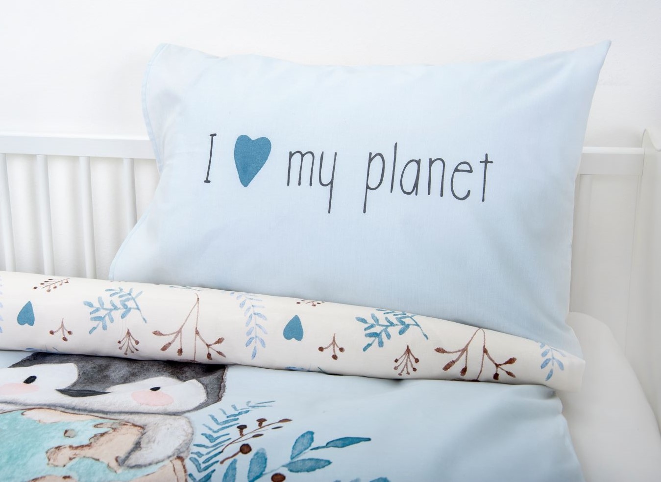 - Liebevoll gestaltete Kinder-Wendebettwäsche mit kleinen Pinguin, Weltkugel, Zweigen und Schriftzug "I love my planet" in pastelligen Blau- und Beigetönen