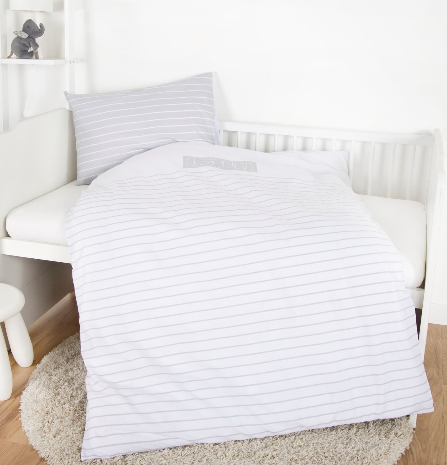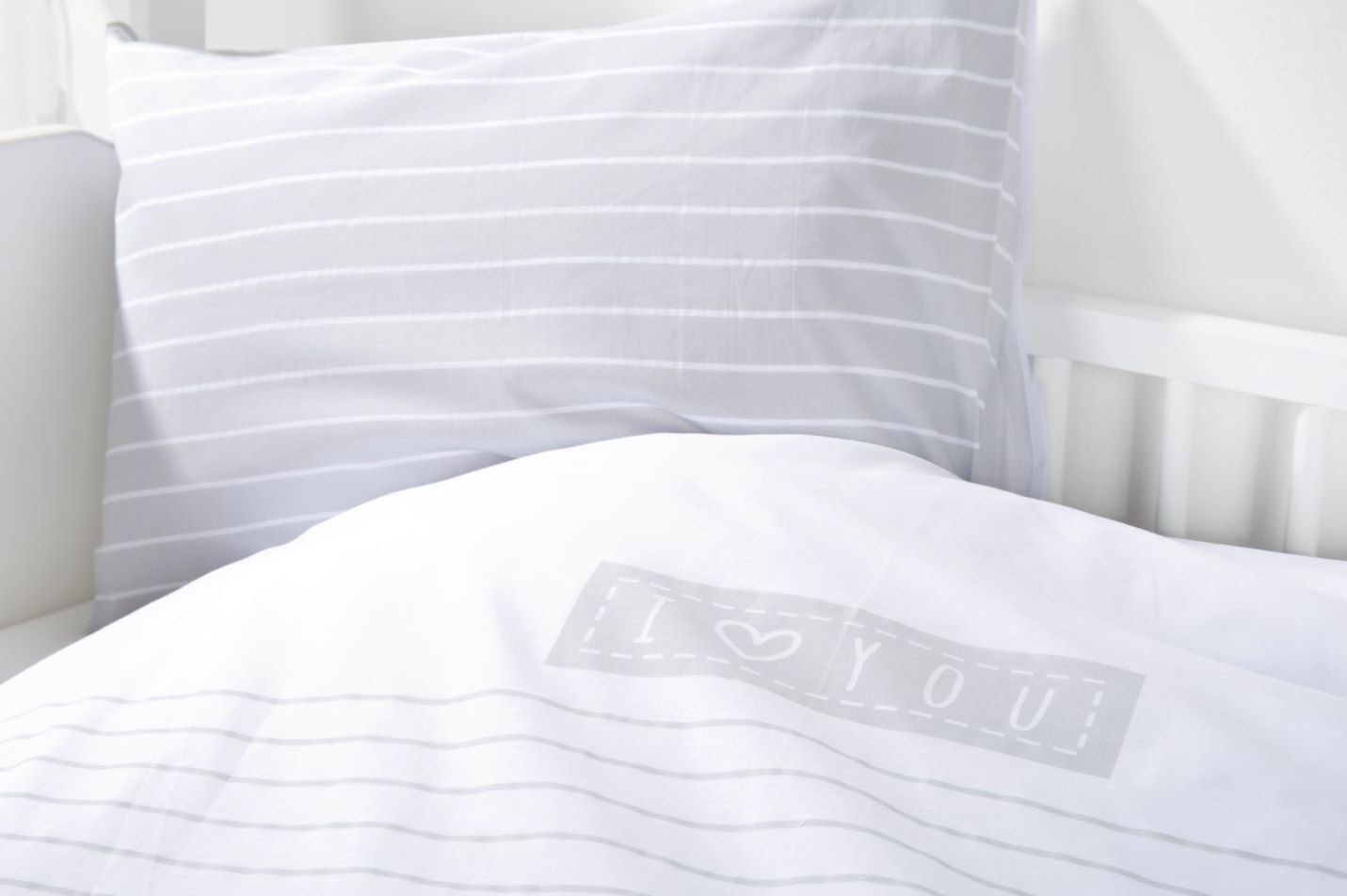 - Schlichte Renforcé Wendebettwäsche mit klassischem Streifendessin und kleinem Schriftzug "I love you" in den Farben Grau und Weiß