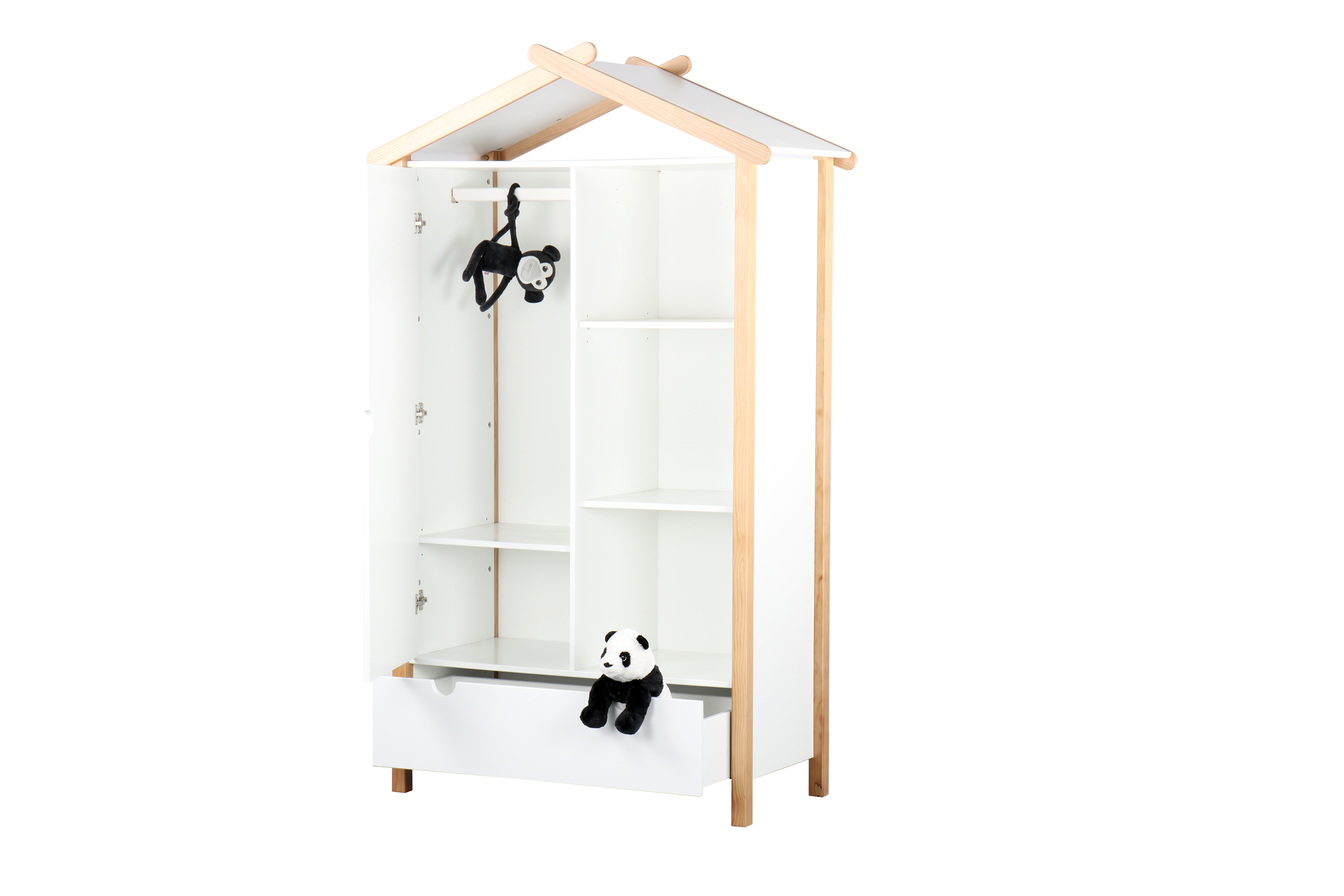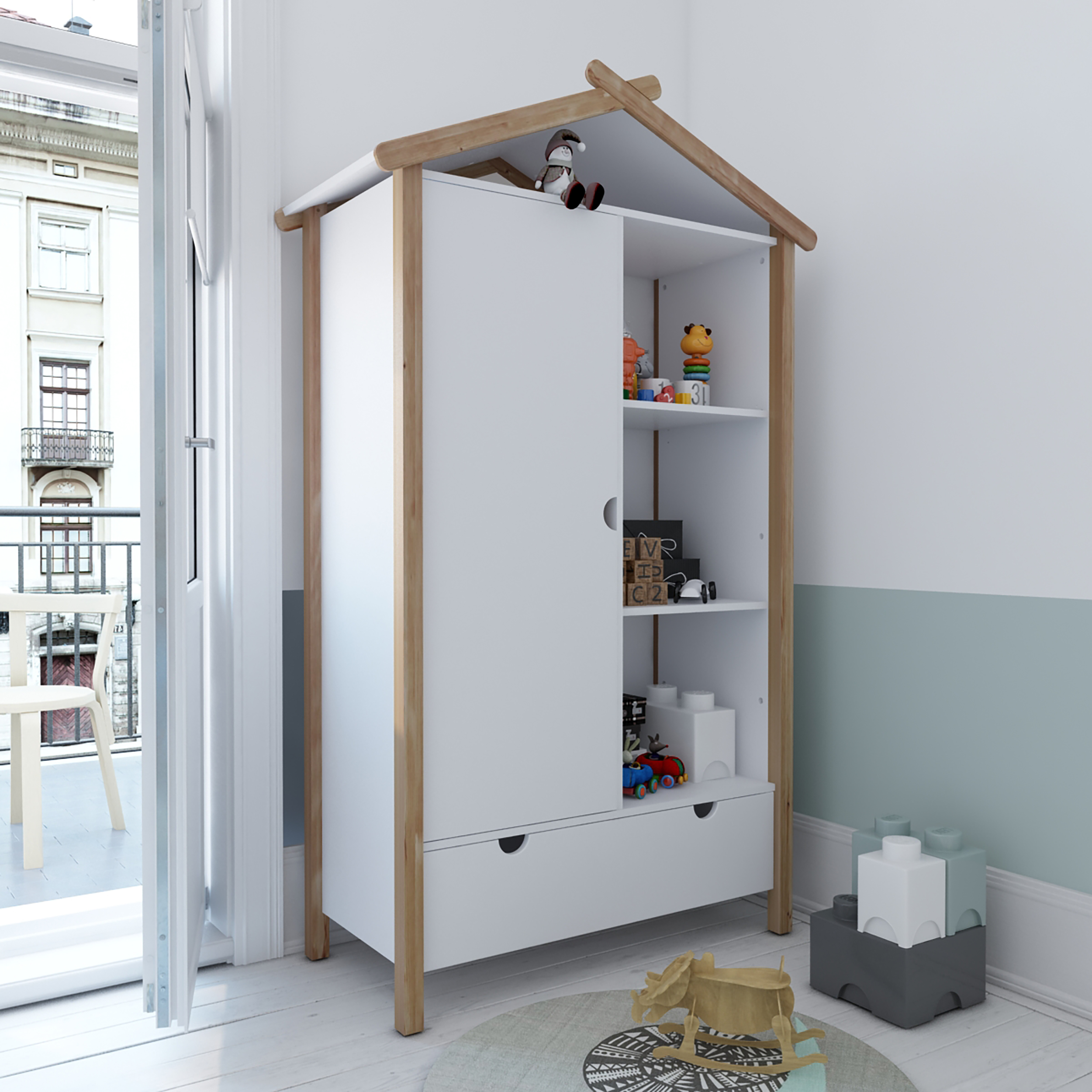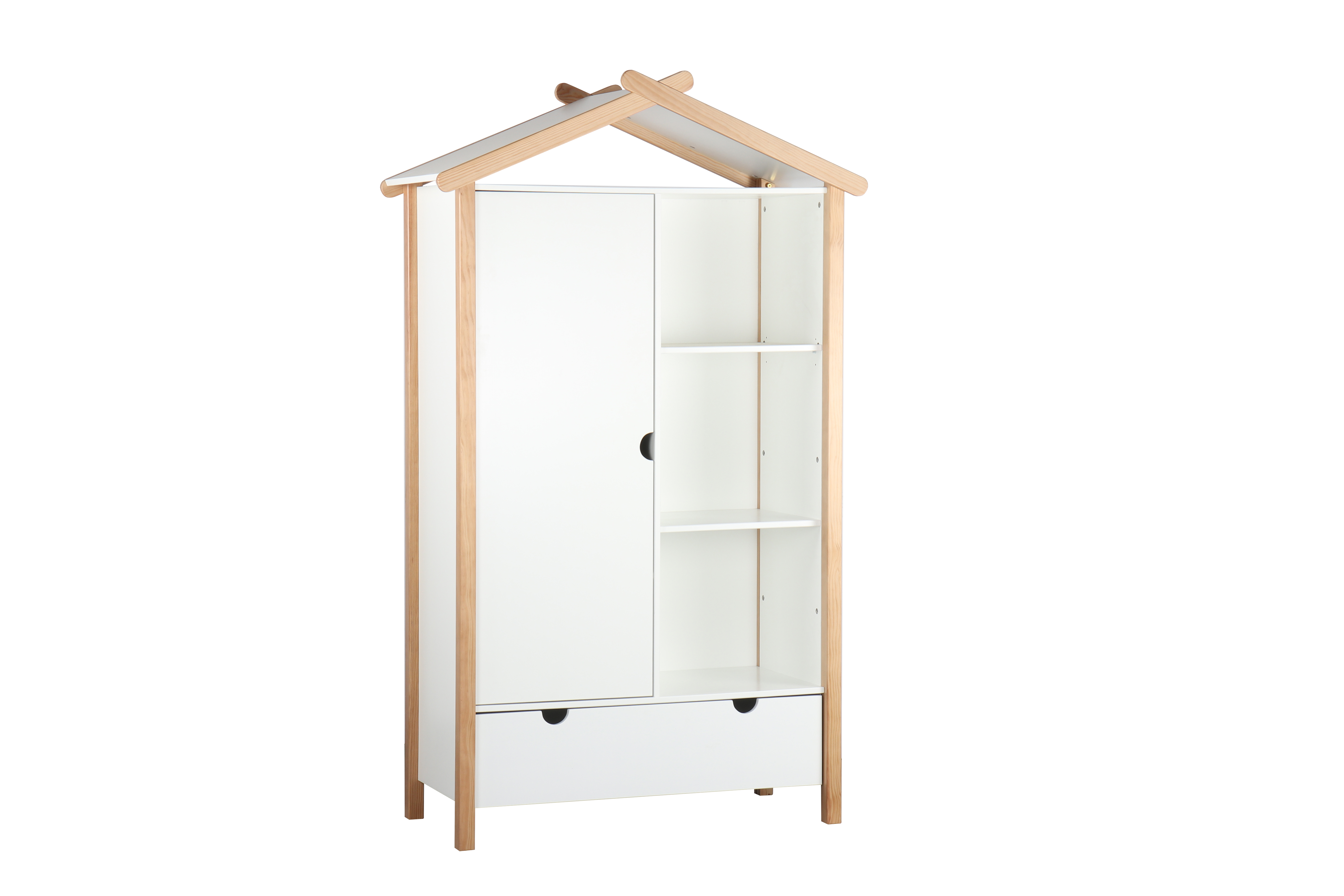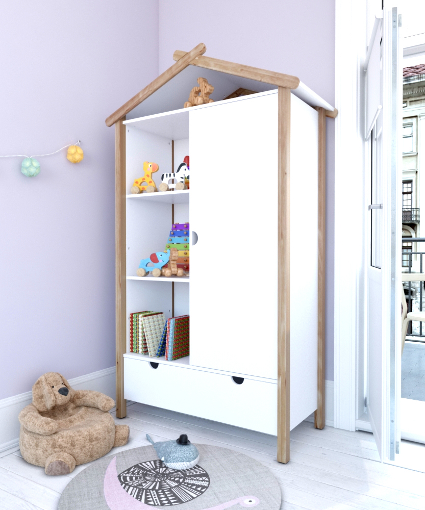 Dieser Kleiderschrank im hausförmigen Design zeigt, dass es in punkto Einrichtung für das Kinderzimmer auch ausgefallen geht. Teils offener und teils geschlossener Stauraum bietet jede Menge Platz, um Ordnung im Kinderzimmer zu halten. Hinter der linken Tür befindet sich eine Kleiderstange und ein weiterer Einlegeboden. Der Schrank besteht aus robustem Kiefernholz und bietet mit seiner skandinavisch schlichten Eleganz eine moderne Unisex Lösung für ein breites Spektrum an Kinderzimmereinrichtung und Altersstufen.