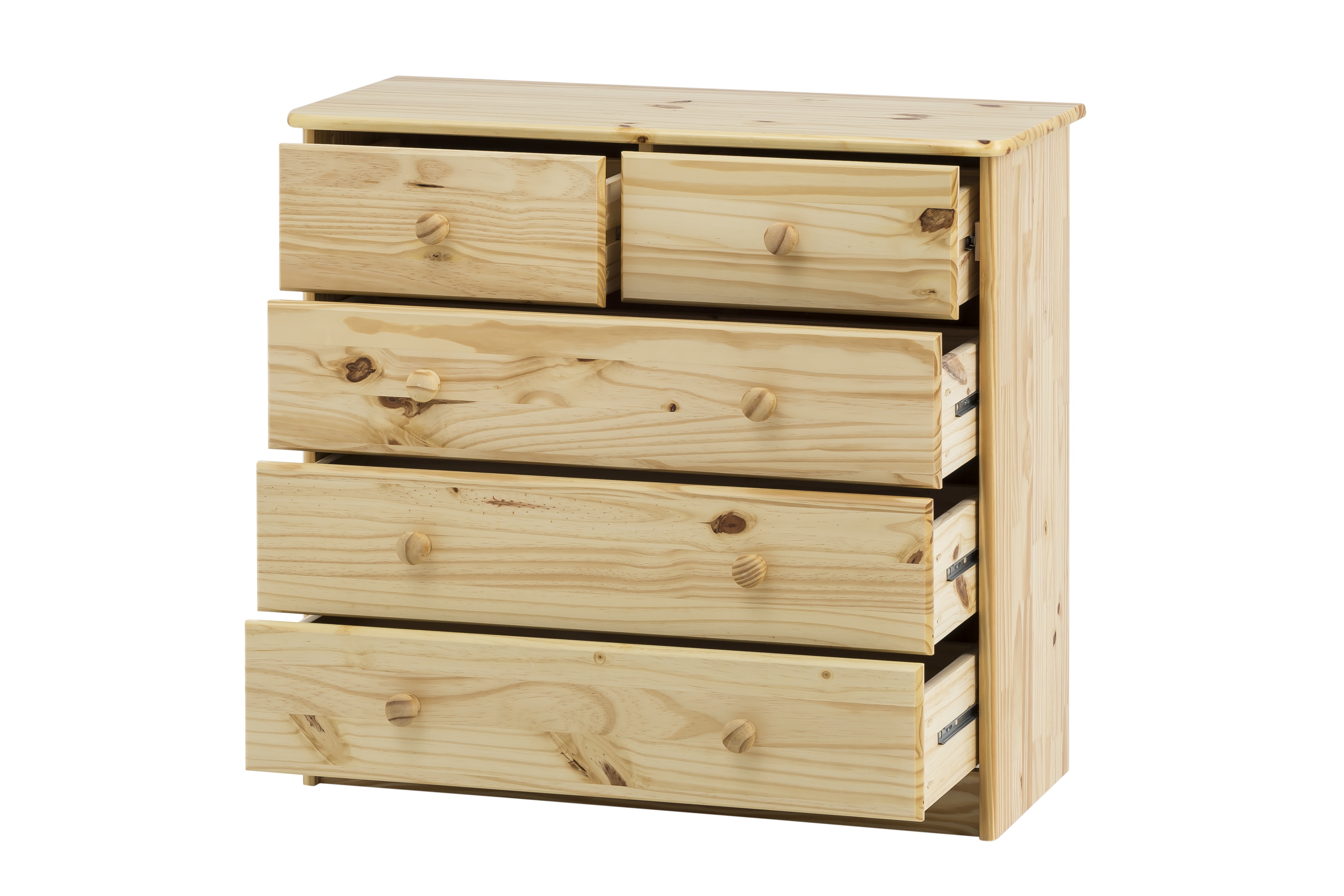 Diese solide und hochwertige Kommode ist aus massivem Kiefernholz gefertigt und die Oberflächen sind zum Schutz lackiert. Viel Stauraum und Platz für diverse Dinge befindet sich in 2 kleinen und 3 großen Schubladen mit Metallauszügen. Ein sehr funktionales Möbelstück, das nicht nur pflegeleicht, sondern auch vielseitig verwendbar ist – ideal zum Beispiel für ein Studentenzimmer, kleine Räume oder Kinderzimmer.