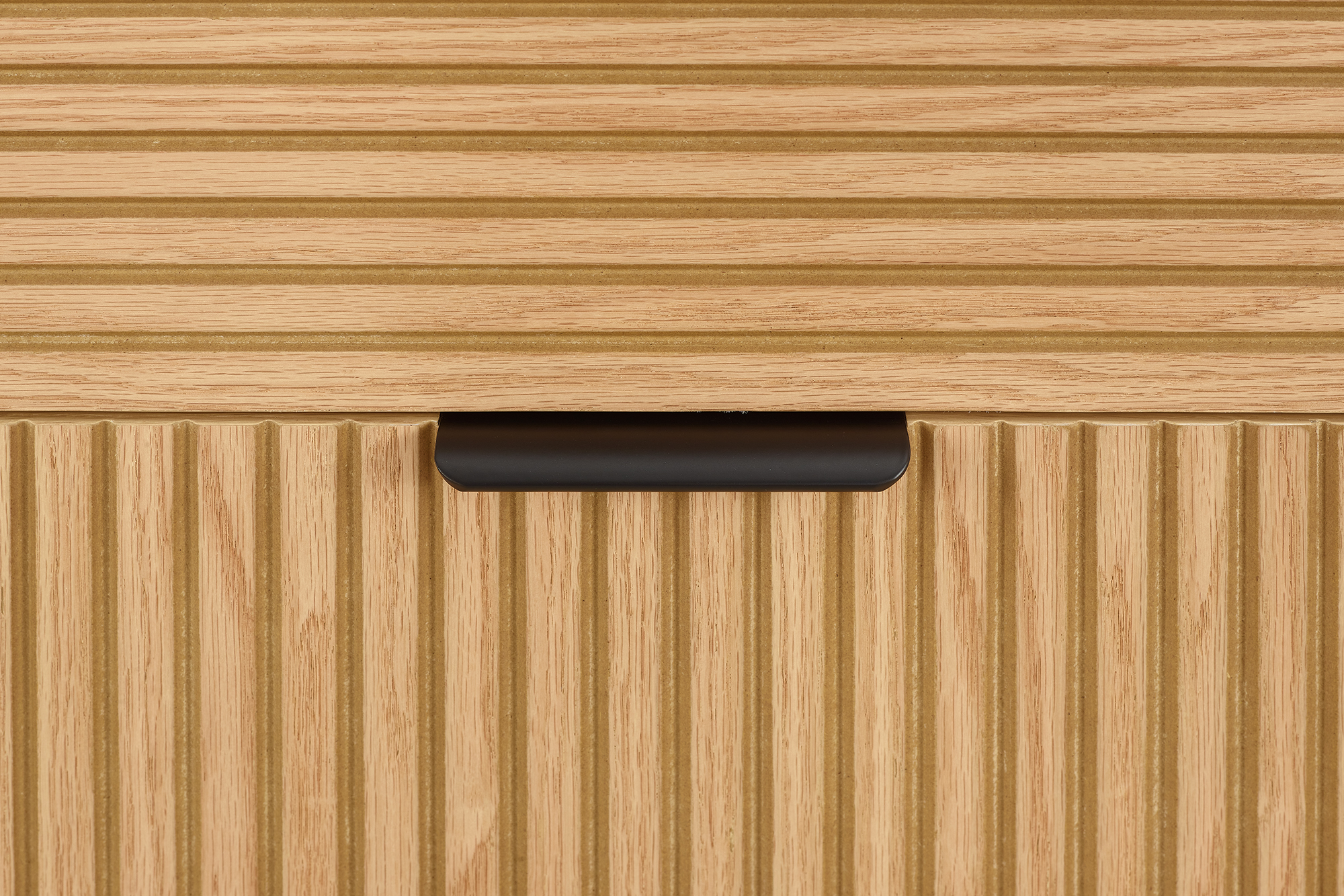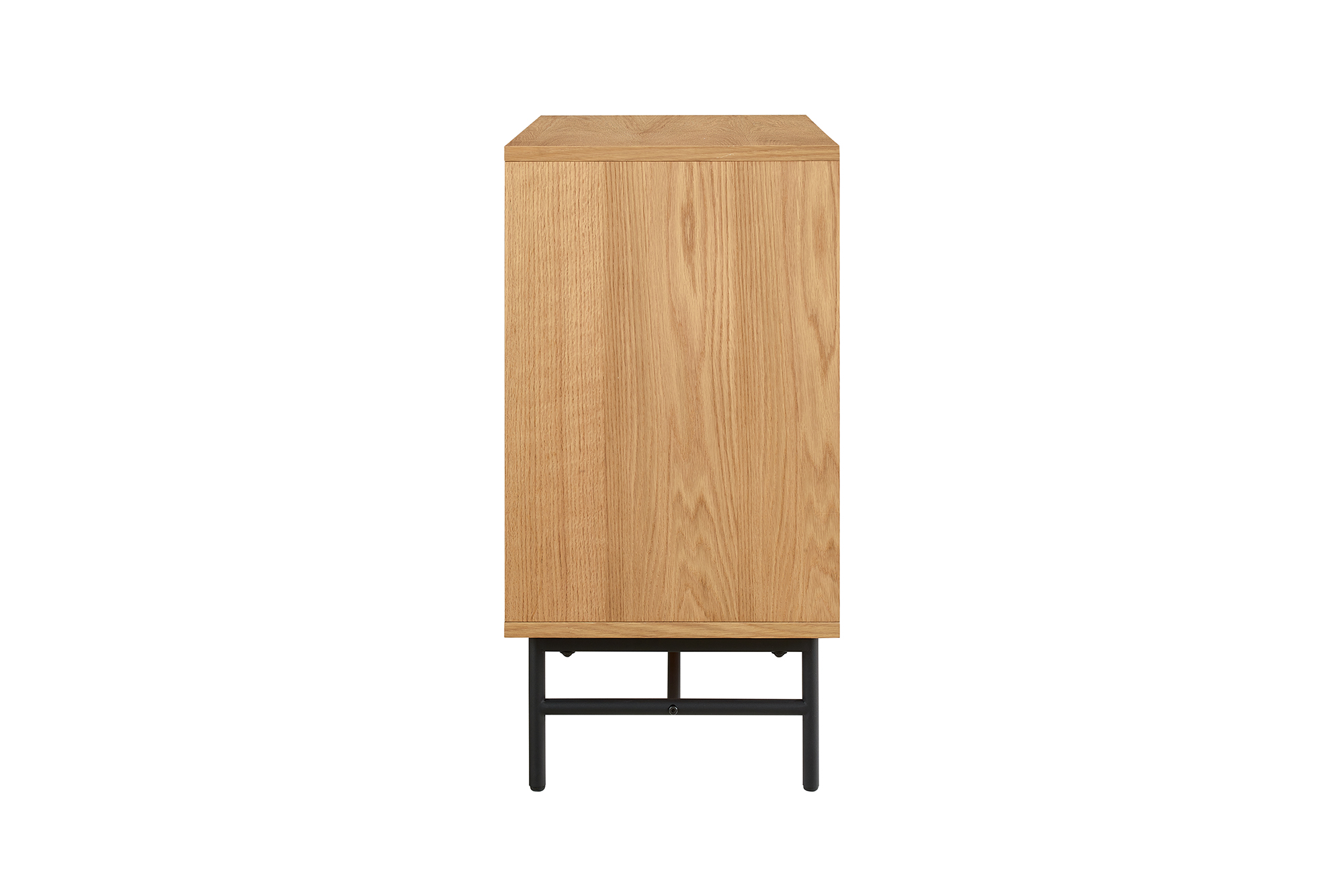 - Front: MDF (Mitteldichte Holzfaserplatte), furniert (Holzart: Eiche), Rückwand: Melamine Eichefarben, Gestell: Metall pulverbeschichtet Schwarz, Korpus mit kratzfester PU-Lackierung.