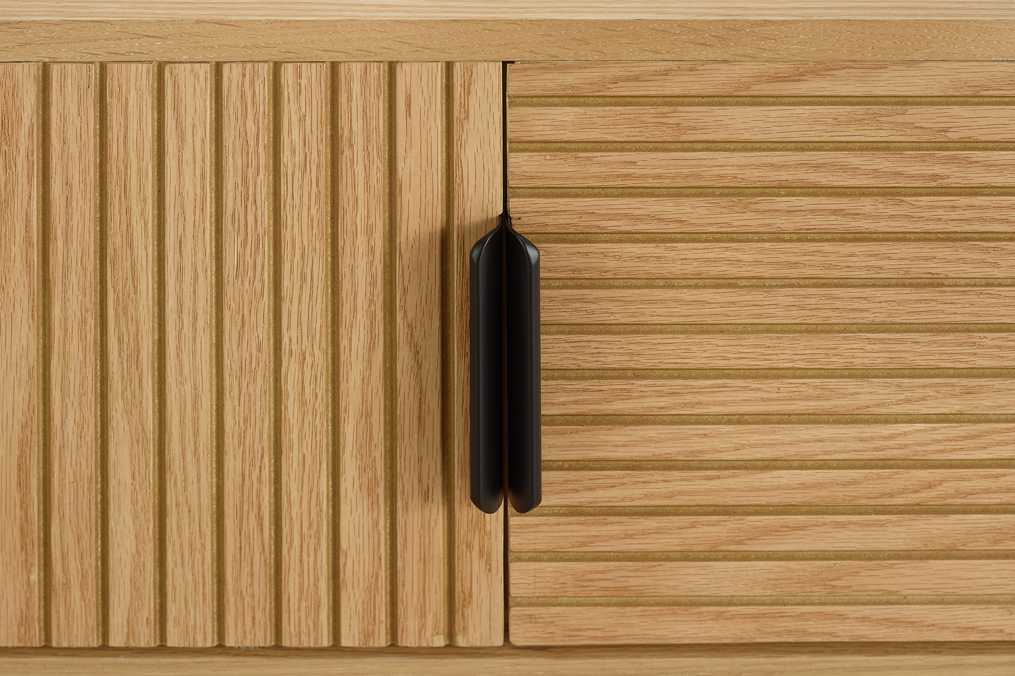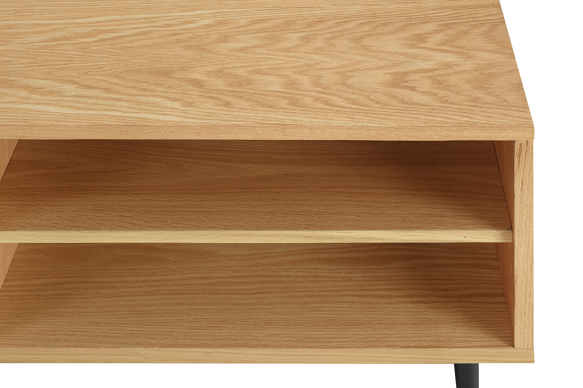 Helles Eiche Echtholzfurnier und hohe, schwarz lackierte Füße sorgen nicht nur für moderne Kontraste, sondern bringen auch den angesagten Scandi Style ins Eigenheim. Die kratzfeste PU-Lackierung auf dem Korpus des Möbels macht dieses besonders widerstandsfähig und langlebig, so dass Sie lange Freude an Ihrem Möbelstück haben. Das Gestell mit den filigranen Beinen sorgt für luftig-leichte Optik und einen modernen Loft-Charakter. Die Paneel-Optik des Eichenfurniers sorgt optisch für das gewisse Etwas. In diesem Lowboard finden in 2 offenen Fächer HiFi-Geräte Platz, die 2 Türen bieten zusätzlich geschlossenen Stauraum.