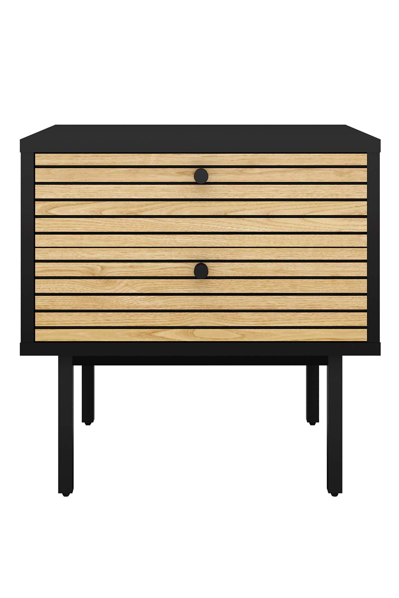 Skandinavischer Stil modern interpretiert! Die Nachtkommode bietet Ihnen schlichte nordische Eleganz. Die Kombination zwischen dem schwarzen Korpus aus MDF-Holz mit Melaminbeschichtung und dem Eiche Echtholzfurnier bildet einen großartigen Kontrast. Die MDF-Holz Front ist mit Eiche Echtholzfurnier ausgestattet und ist somit ein echter Blickfang. Hinter 2 Schubladen bietet sich genügend geschlossener Stauraum für die verschiedensten Sachen. Die Ablagefläche auf der Nachtkommode kann wunderbar für eine Nachtischlampe genutzt werden. Lassen Sie sich mit der Nachtkommode ins Land der Träume entführen. Das Schränkchen kann auch als Beistellkommode in Flur, Diele, Wohnzimmer oder einem anderen Raum zum Einsatz kommen. Der Nutzung sind hier fast keine Grenzen gesetzt.