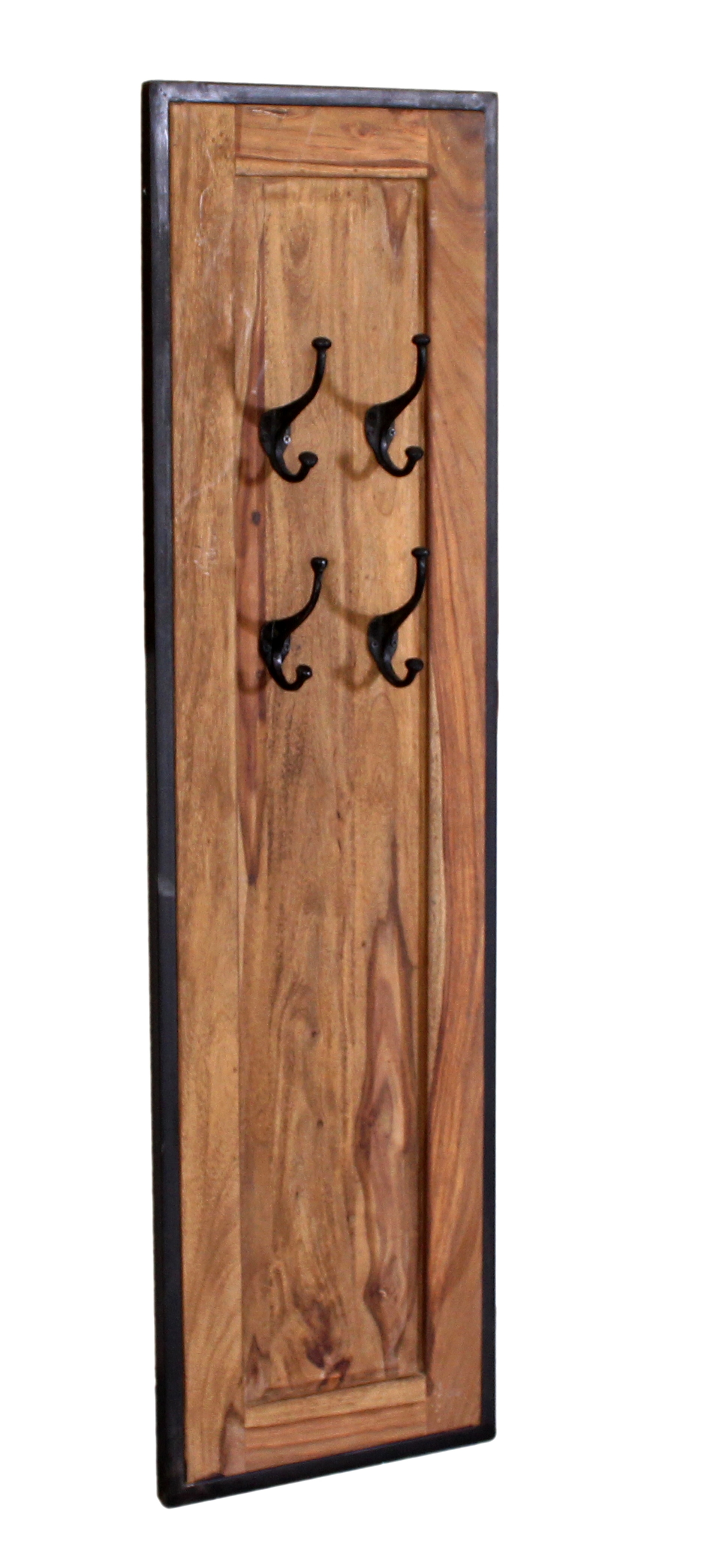 Diese Wandgarderobe in naturfarbigem Mangoholz mit schwarzem Metall abgesetzt sorgt für Ordnung in Flur und Diele oder Eingangsbereich. Die Hängegarderobe ist mit 3 stabilen Doppelhaken versehen, so dass an insgesamt 6 Haken Platz für Jacken, Mäntel, Handtaschen, Schal, Taschen ist. Der Materialmix von rustikalem Holz in warmem Naturton und glattem Metall liegt voll im Trend und sorgt für interessante Kontraste in der Optik. Das Wandpaneel ist kombinierbar mit modernen Garderobenmöbeln, passt in jede kleine Wohnung und findet in vielen Nischen einen Platz. Richtig integriert ergeben diese Möbel auch in modernem Ambiente ein besonderes Bild.