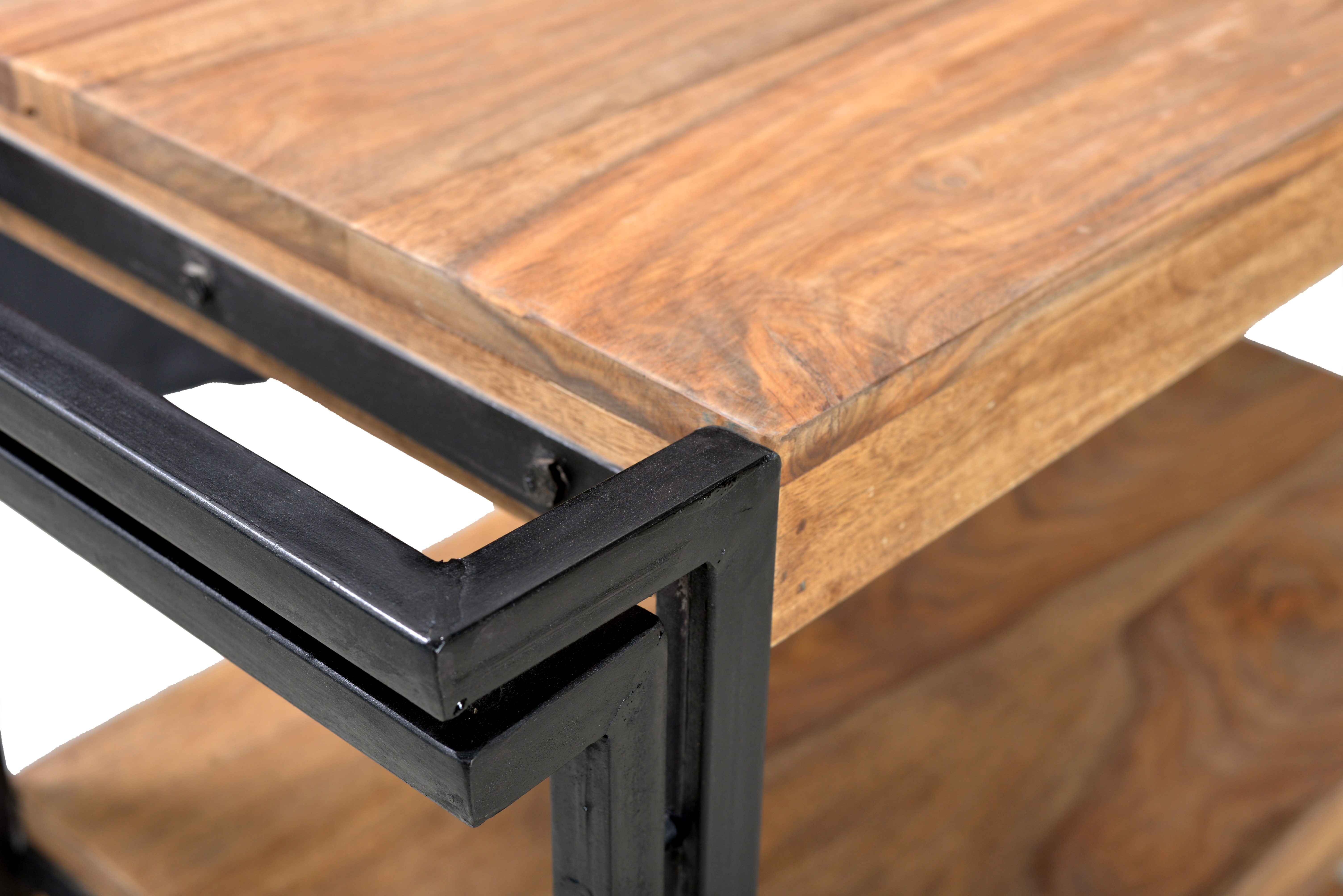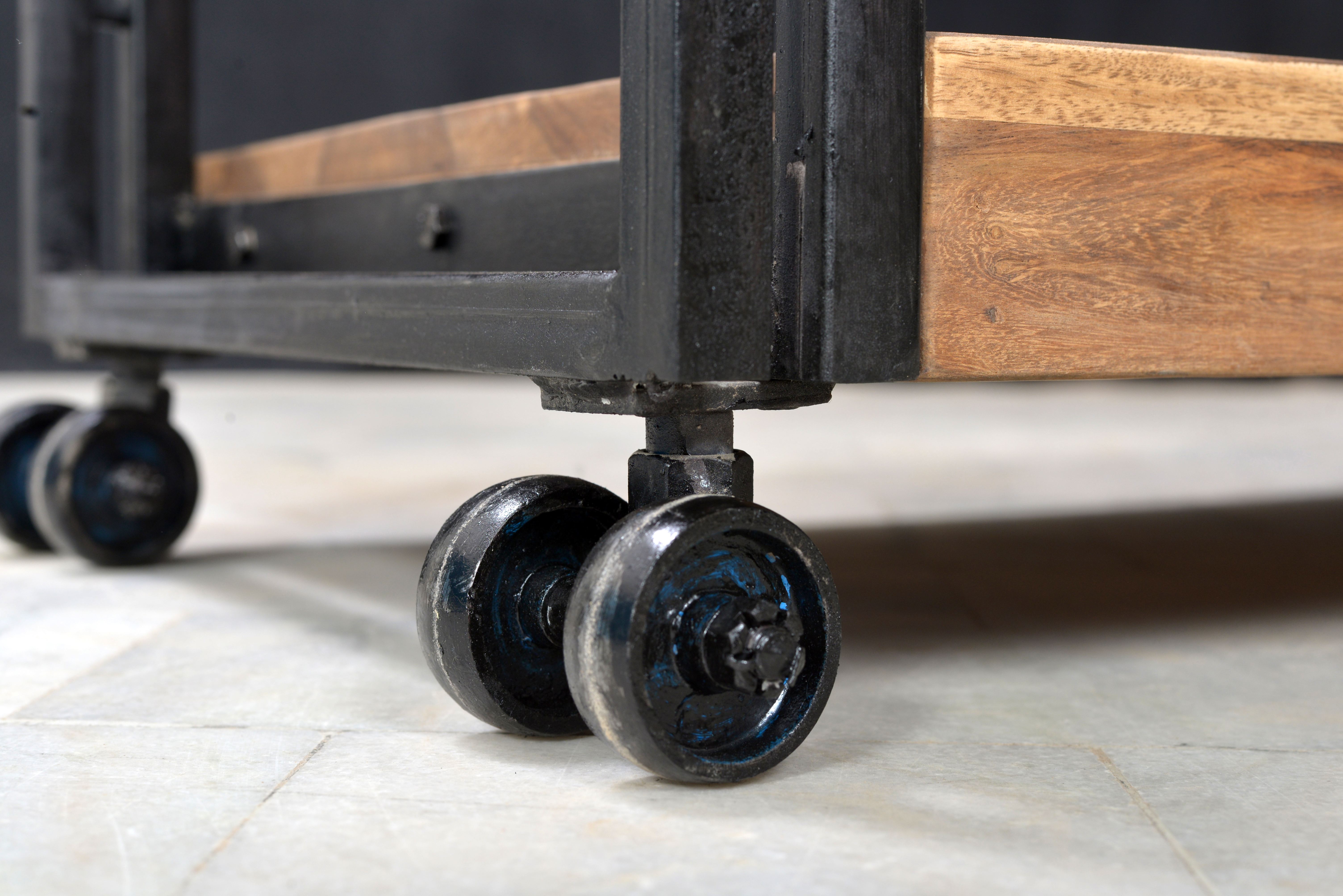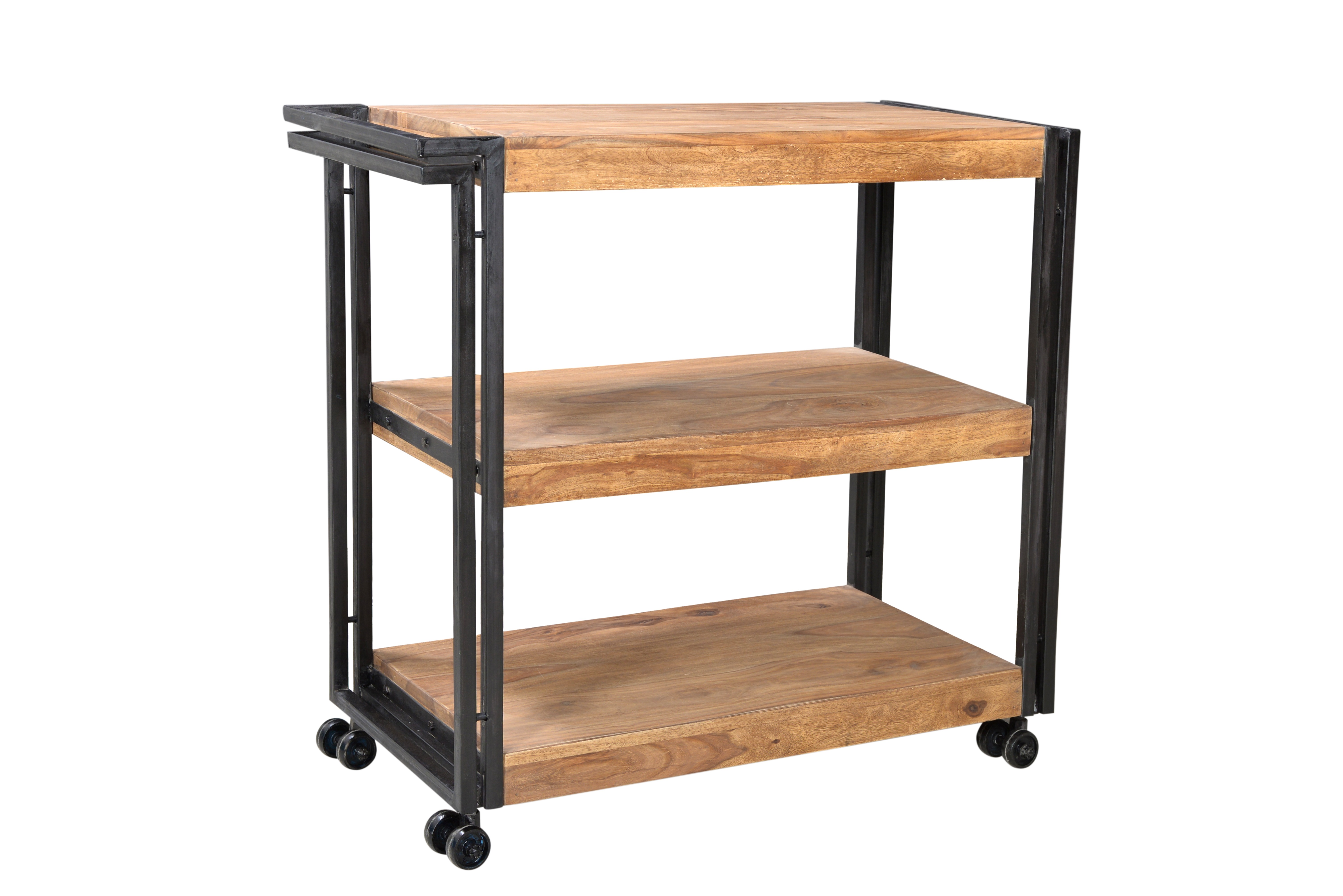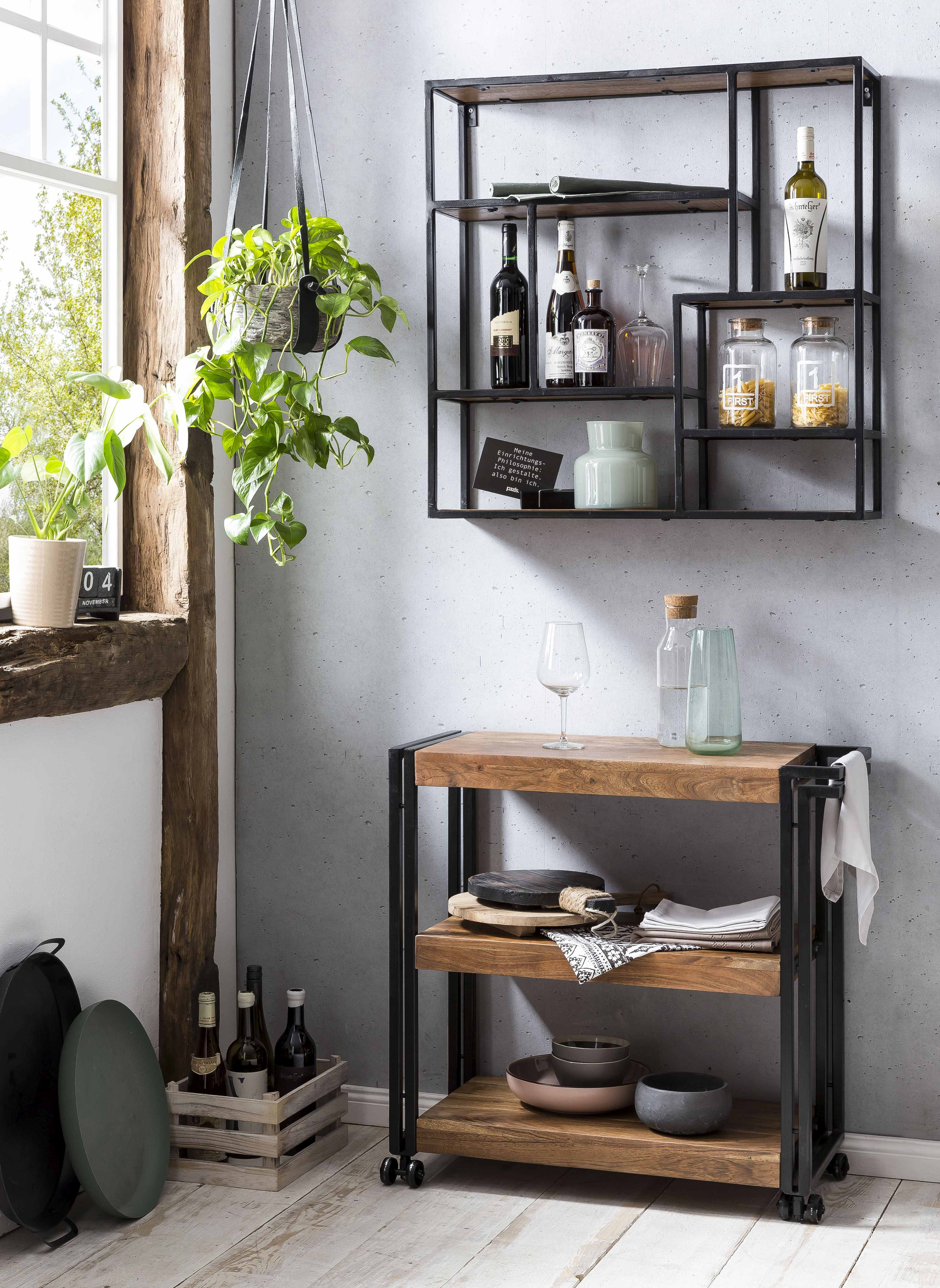 Dieser Küchenwagen, gefertigt aus Akazie, ist ein Blickfang, denn das beliebte Factory-design wurde hier besonders gut umgesetzt. Der Küchenschrank ist Regal, Ablage, Anrichte und Zubereitungsfläche in einem. Wer wünscht sich nicht eine flexible Insel in der Küche? Die Rollen lassen das Küchenmöbel an seinem Griff bequem dorthin schieben, wo man es gerade benötigt. Die auf alt getrimmten 3 Böden in Kombination mit dem Gestell aus Altmetall lassen das Küchenregal auf 4 Rädern zu einem Eyecatcher werden. Das beliebte Fabrikflair erlaubt es, dass die flexible Kücheninsel kombinierbar ist mit schon vorhandenem Mobiliar, ob Landhaus, Vintage, Industrie Look oder Shabby Chic, und auch mit modernen Küchen oder Esszimmern integrierbar ist.