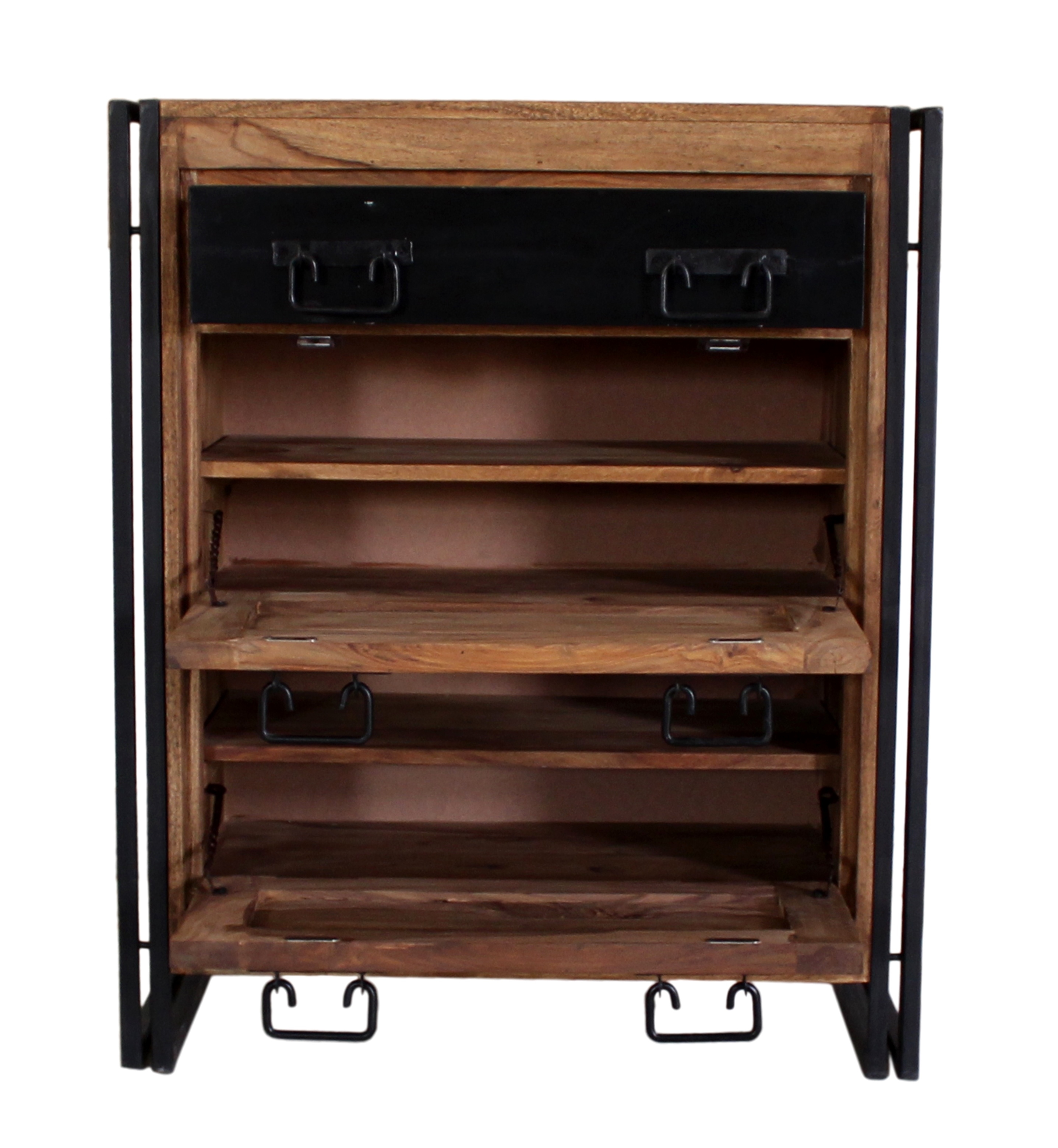 Jetzt kommt Ordnung in den Eingangsbereich. Dieser moderne Schuhschrank im Factory-Design ist ein Blickfang in jedem Ambiente. Das Metall und das Holz wurden in aufwändiger Handarbeit „auf alt getrimmt“, um durch den „Used-Look“ ein stimmiges Bild zu erreichen. Gerade die Kombination mit normalen Möbeln ist sehr reizvoll und schon wenige Teile reichen, um in bestehender Einrichtung ein völlig neues Ambiente zu erschaffen. Über herumliegende Schuhe müssen Sie sich jetzt nicht mehr ärgern – im Schrank findet sich Platz für ca. 10 Paar Schuhe.