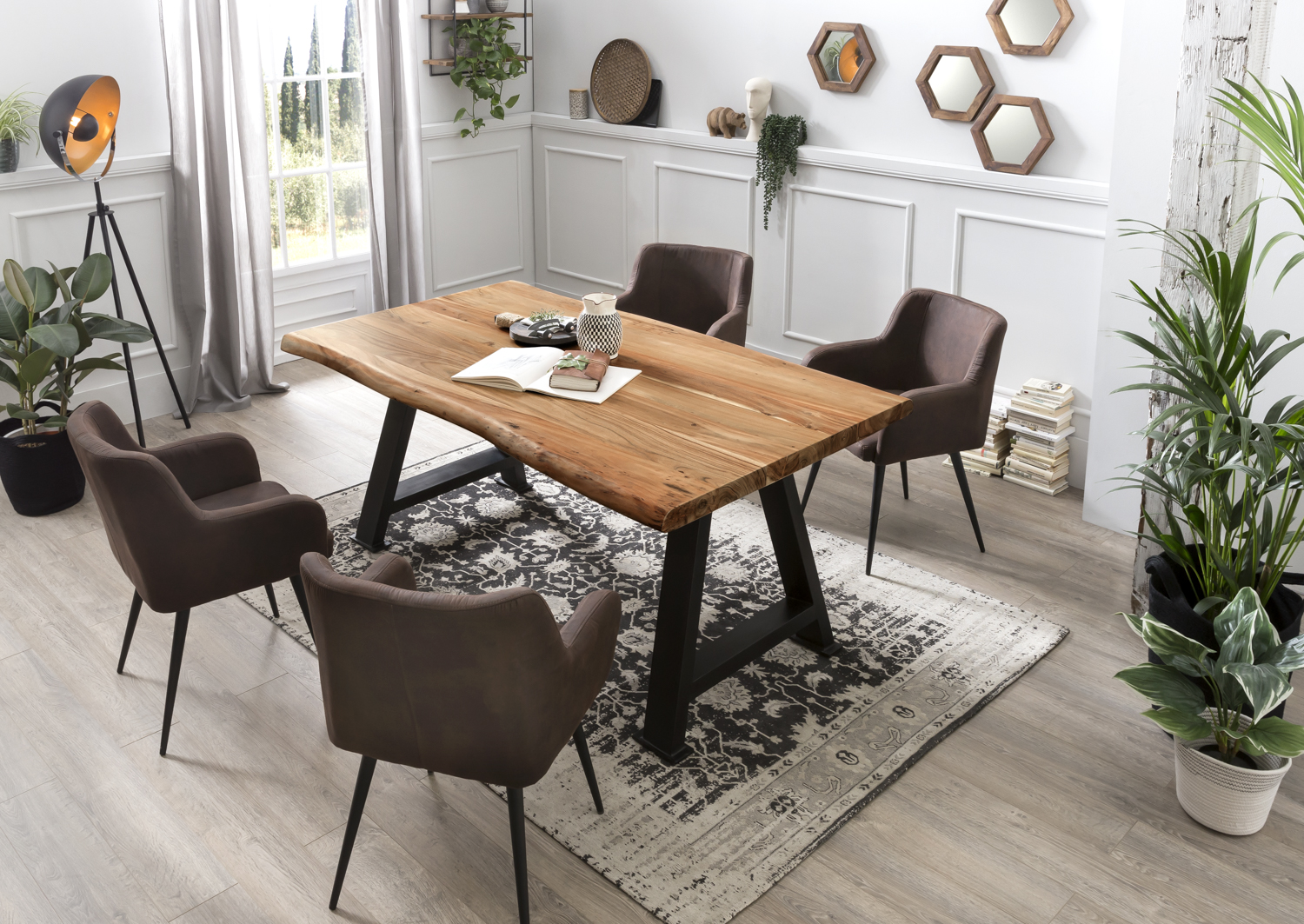 Dieser moderne sechseckige Spiegel ist ein Blickfang in jedem Ambiente. Das Akazieholz wurde in aufwändiger Handarbeit auf alt getrimmt, um durch Used Look ein stimmiges Bild zu erreichen. Auch die Kombination mehrerer Spiegel ist sehr reizvoll und bringt immer wieder ein völlig neues Ambiente.
