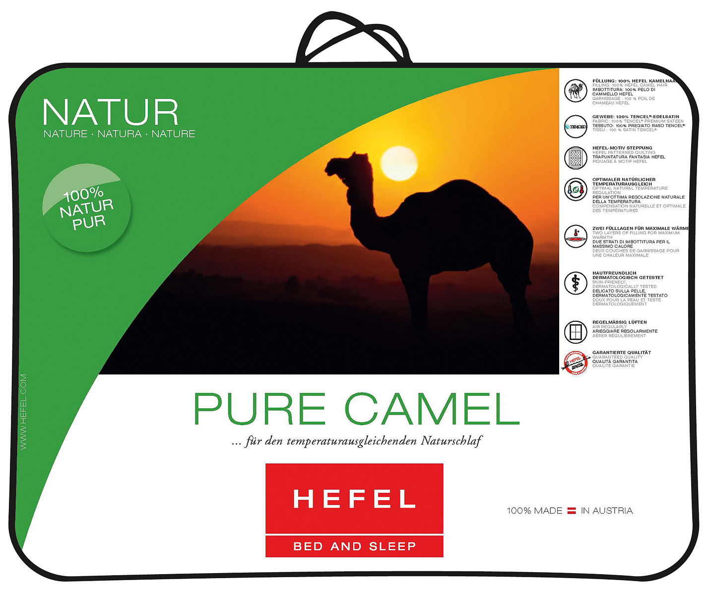 • Kamele kommen durch ihr Fell mit Temperaturschwanken von bis zu 60°C zwischen Tag und Nacht bestens zurecht, diese tolle Eigenschaft nutzte Hefel für die Einziehdecke Camel Pure und entwickelte eine Decke mit "natürlicher Klimaanlage", die einerseits angenehm wärmt und andererseits vor Hitze schützt