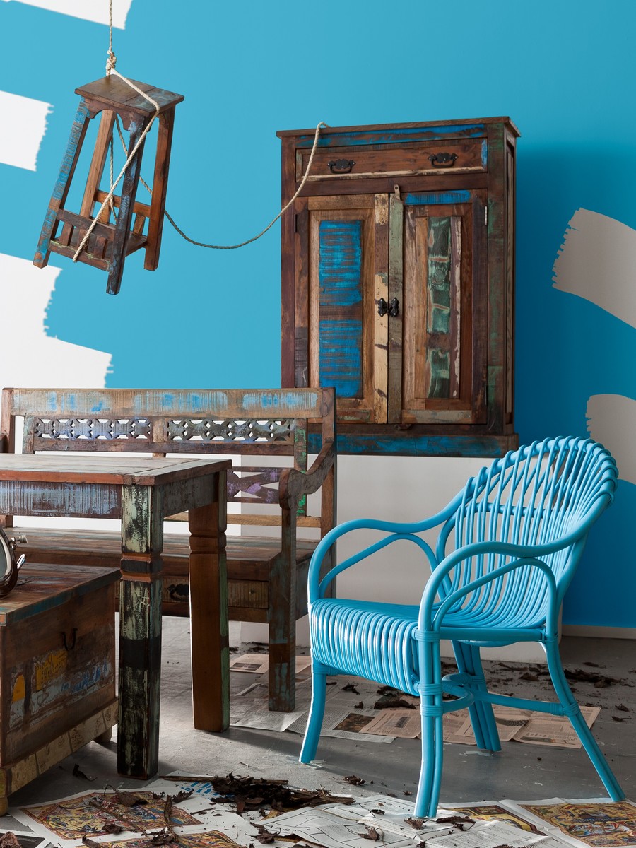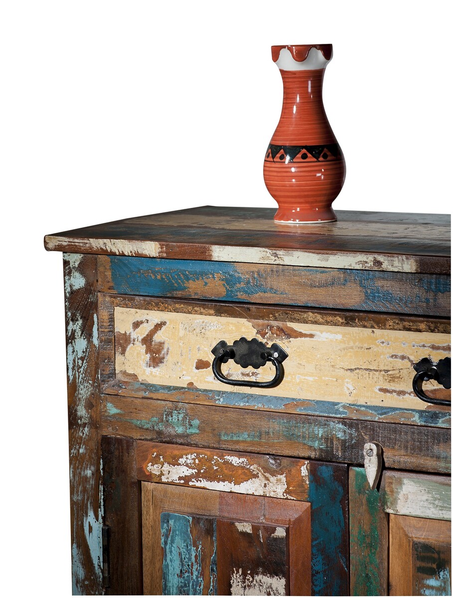 Ein Möbel dessen Holz (natürlich FSC-zertifiziert) aus recycelten Fischerbooten stammt - ungewöhnlich? Ja, aber wer will schon "gewöhnlich" ? In Indien fanden wir einen kleinen Betrieb, der sich darauf spezialisiert hat, ausrangierte Boote zu Möbeln umzuwandeln. Jedes Stück Holz wird so "gelegt", daß sich ein harmonisches Bild ergibt. Durch den Verzicht auf moderne Hilfsmittel bekommt jedes Stück ein eigenes "Gesicht" fernab unserer oft langweiligen Perfektion. Richtig integriert ergeben diese Möbel auch in modernem Ambiente ein besonderes Bild.
