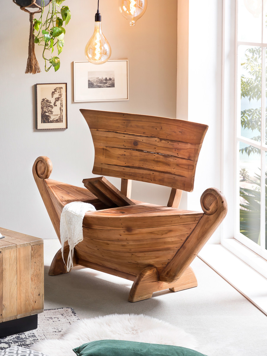 Teakholz, handwerkliche Fertigung, Verzicht auf moderne Hilfsmittel – dies sind alles Grunde, warum sich diese massive Holzbank in Bootsform sofort von der Masse abhebt. Die zwei eingebauten Klappen, bieten genügend Stauraum für diverse kleinere Utensilien. Auf der Sitzbank können 1 bis 2 Personen Platz finden. Diese Möbel haben einfach deutlich mehr Charme und Ausstrahlung. Zudem sind sie ein garantierter Blickfang in Ihrem Zuhause.
