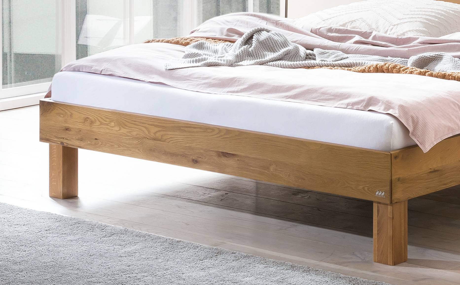 Das Bett Renzetti aus geölter Wildeiche besticht durch ausdrucksstarke Füße und klare Linie. Die breiten und eckigen Holzfüße verleihen dem Bett Standfestigkeit und lassen es ausdrucksvoll im Raum wirken. Ein originelles natürlich geformtes Kopfteil mit Baumkante betont zudem die Ursprünglichkeit des Bettes. Das leicht geneigte Kopfteil aus Massivholz lädt zum Anlehnen beim Frühstück im Bett ein und macht das Bett zu einer Oase der Gemütlichkeit.
