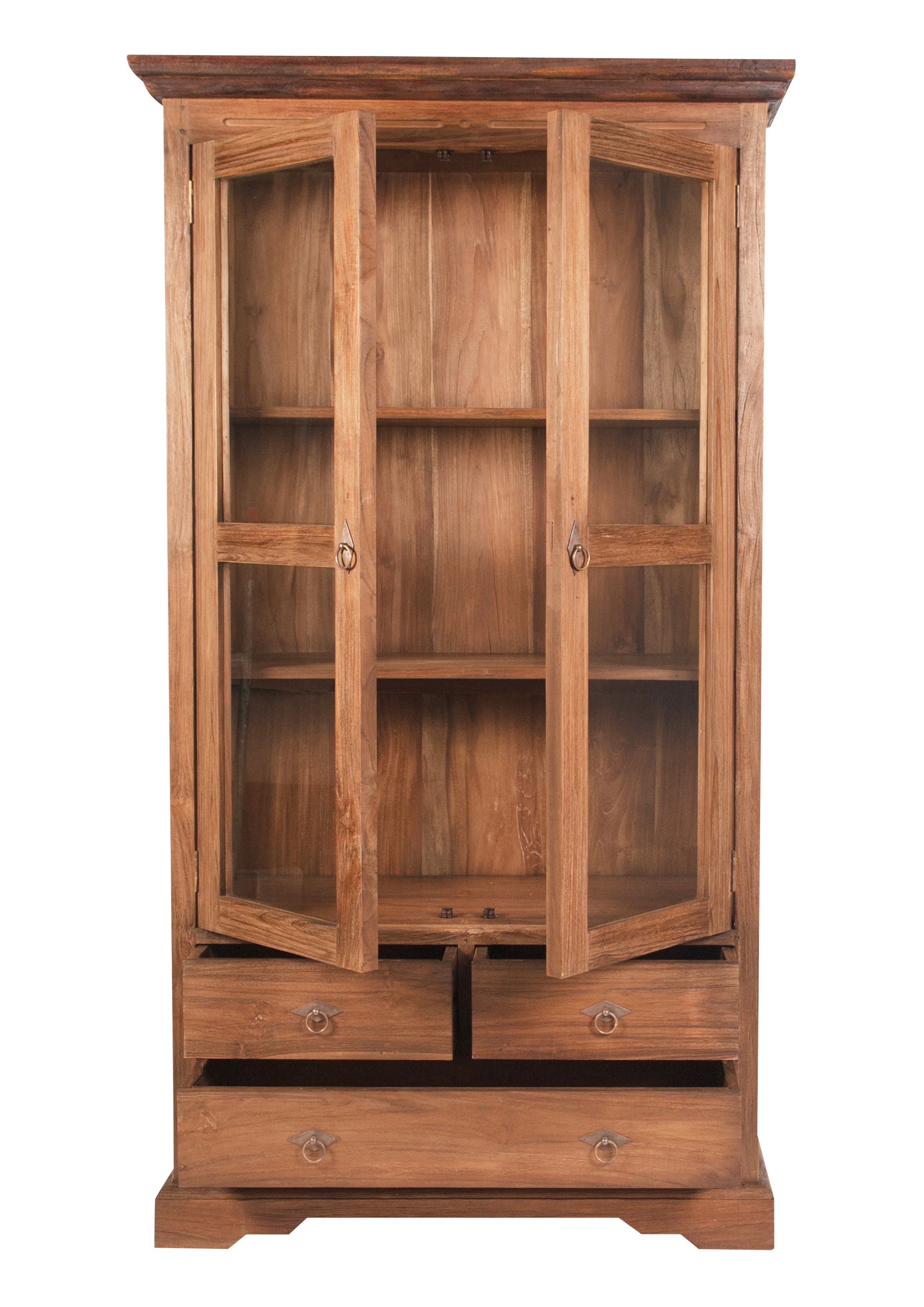Holen Sie sich mit dieser Schrankvitrine einen Hauch Natürlichkeit direkt in Ihr Zuhause. Der natürlich wirkende Schrank bietet genügend Stauraum hinter 2 Glastüren und in 3 Schubkästen für vielerlei Dinge. Die 2 verglasten Türen mit 2 Einlegeböden verführen geradezu, dieses Möbel als Geschirrschrank zu nutzen. Selbst Aktenordner würden hier einen wahrhaft schicken Platz bekommen, täte diese Vitrine ihren Dienst als Büroschrank. In den drei Schubkästen findet sich ebenfalls zusätzlicher Stauraum. Die kolonialfarbene Deckplatte eignet sich für diverse Dekorationsmöglichkeiten und lässt die Schönheit des Vitrinenschranks erst richtig zur Geltung kommen.