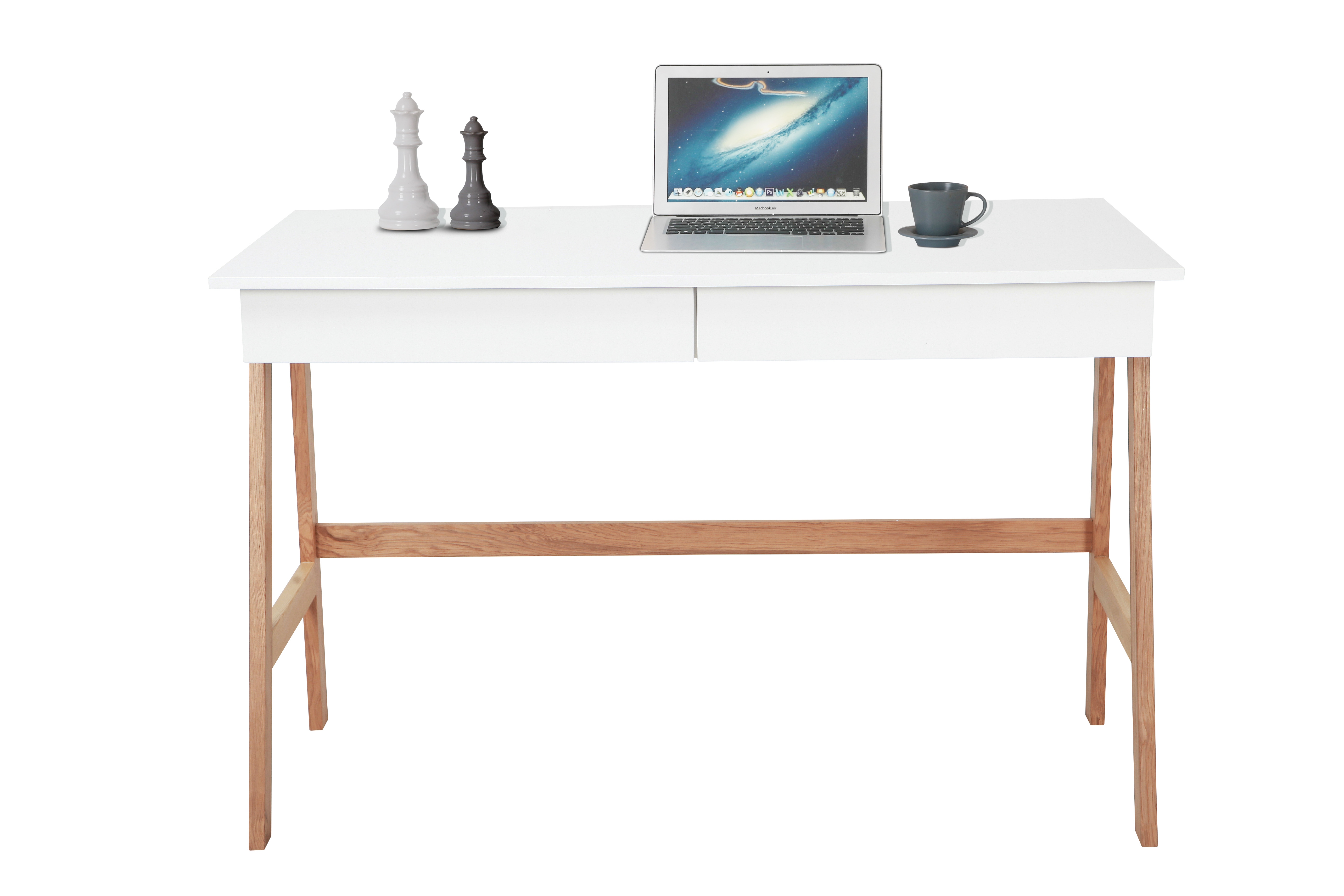 Dieser Schreibtisch im klassischen skandinavischen Design lässt sich durch seine handliche Größe in jedem Raum unterbringen. Die nordisch-moderne Farbkombination von weiß lackiertem Korpus und naturbelassenem Holz verleihen dem Schreibtisch ein besonders luftiges Flair und lassen ihn auch in kleinen Räumen nicht zu massiv wirken. Die moderne Optik des Schreibtisches wird durch die grifflose Optik der beiden Schubladen noch zusätzlich unterstrichen.
