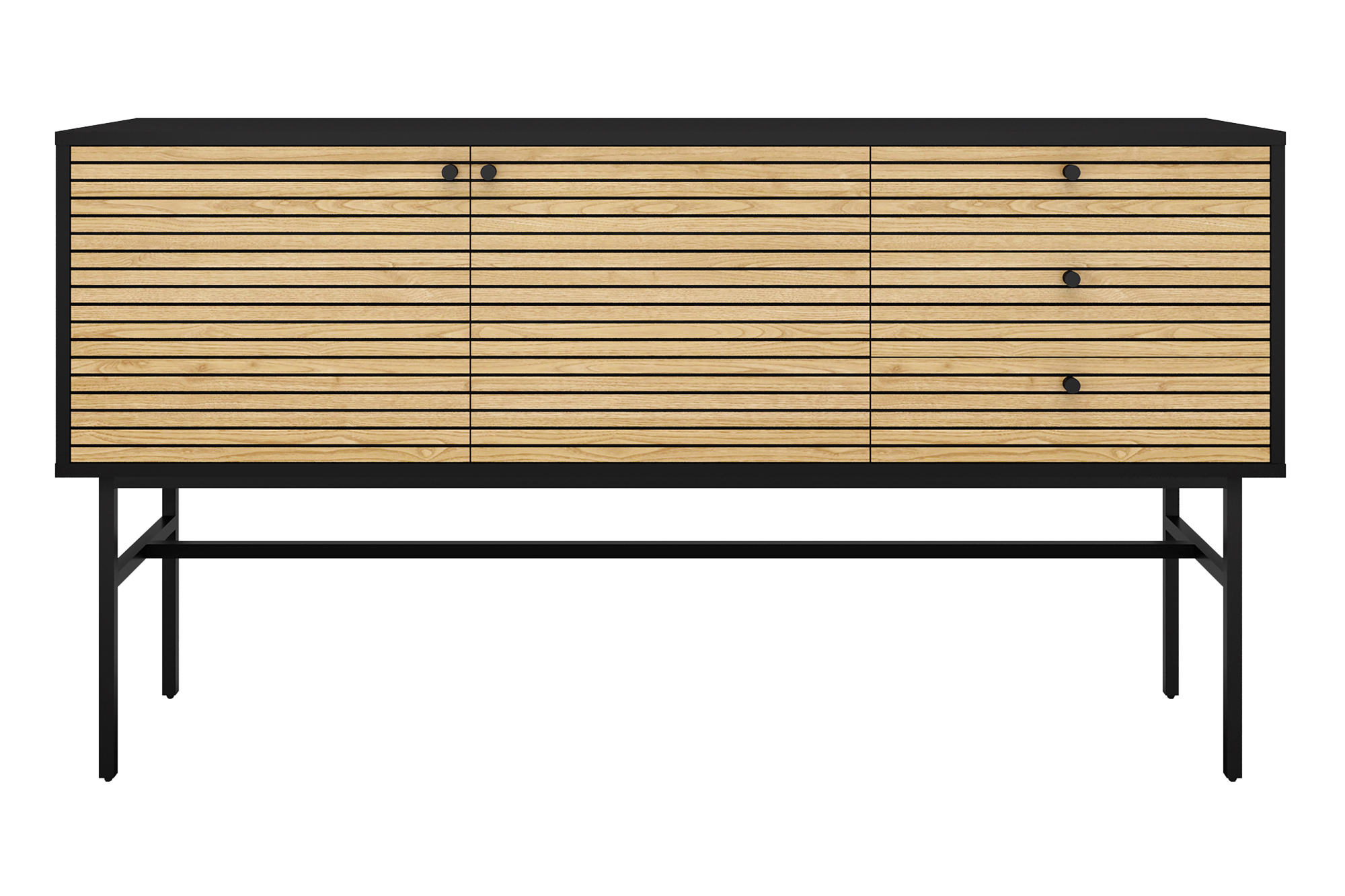Skandinavischer Stil modern interpretiert! Das Sideboard bietet Ihnen schlichte nordische Eleganz. Die Kombination zwischen dem schwarzen Korpus aus MDF-Holz mit Melaminbeschichtung und dem Eiche Echtholzfurnier bildet einen großartigen Kontrast. Die MDF-Holz Front ist mit Eiche Echtholzfurnier ausgestattet und ist somit ein echter Blickfang. Hinter zwei Türen und drei Schubladen bietet sich genügend Stauraum für die verschiedensten Sachen. Auf der Deckplatte finden Blumen oder Dekorationen ihren Platz. Egal ob in Ihrem Esszimmer oder in Ihrem Schlafzimmer - mit diesem Sideboard stehen Ihnen alle Möglichkeiten offen!