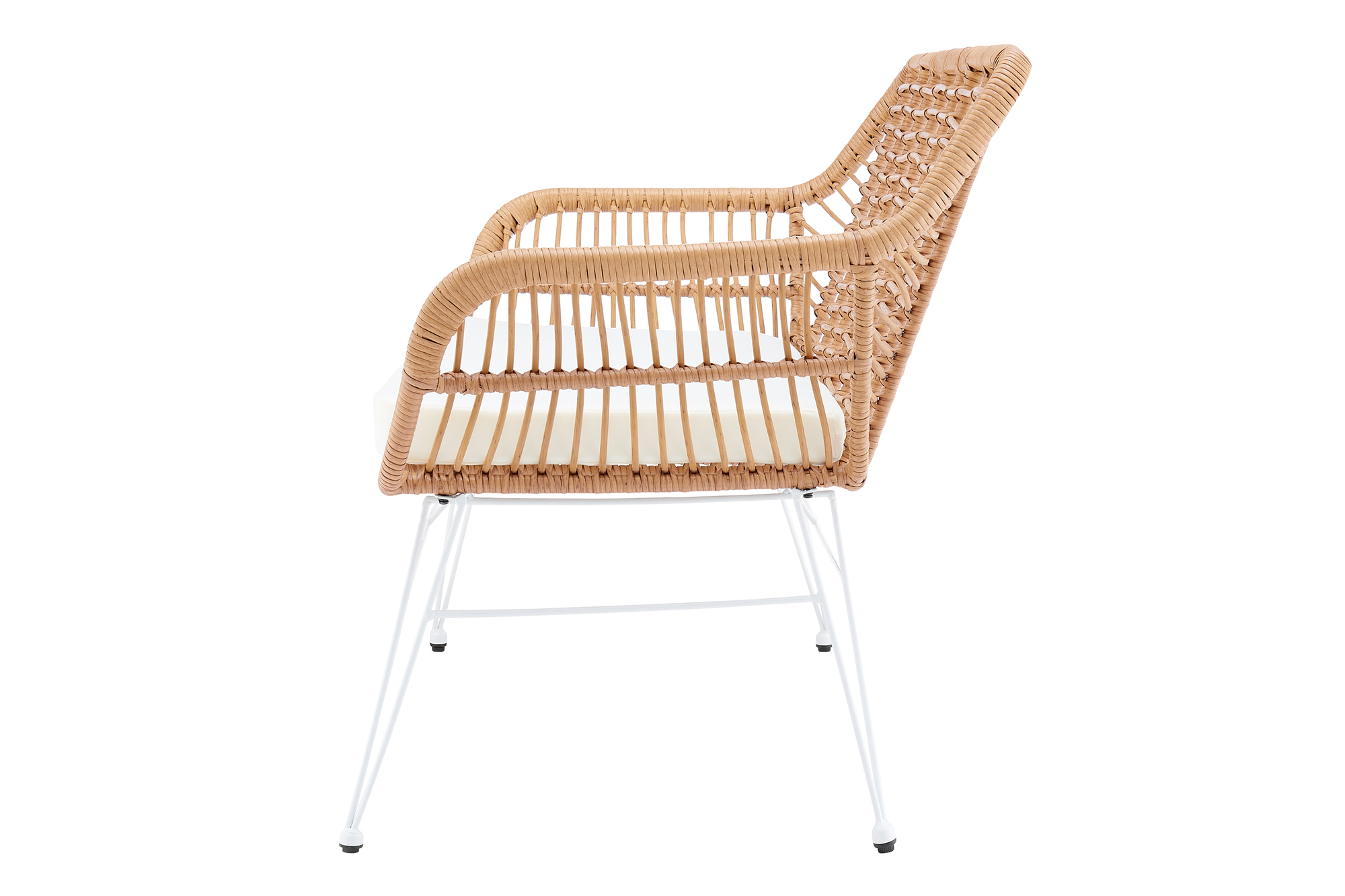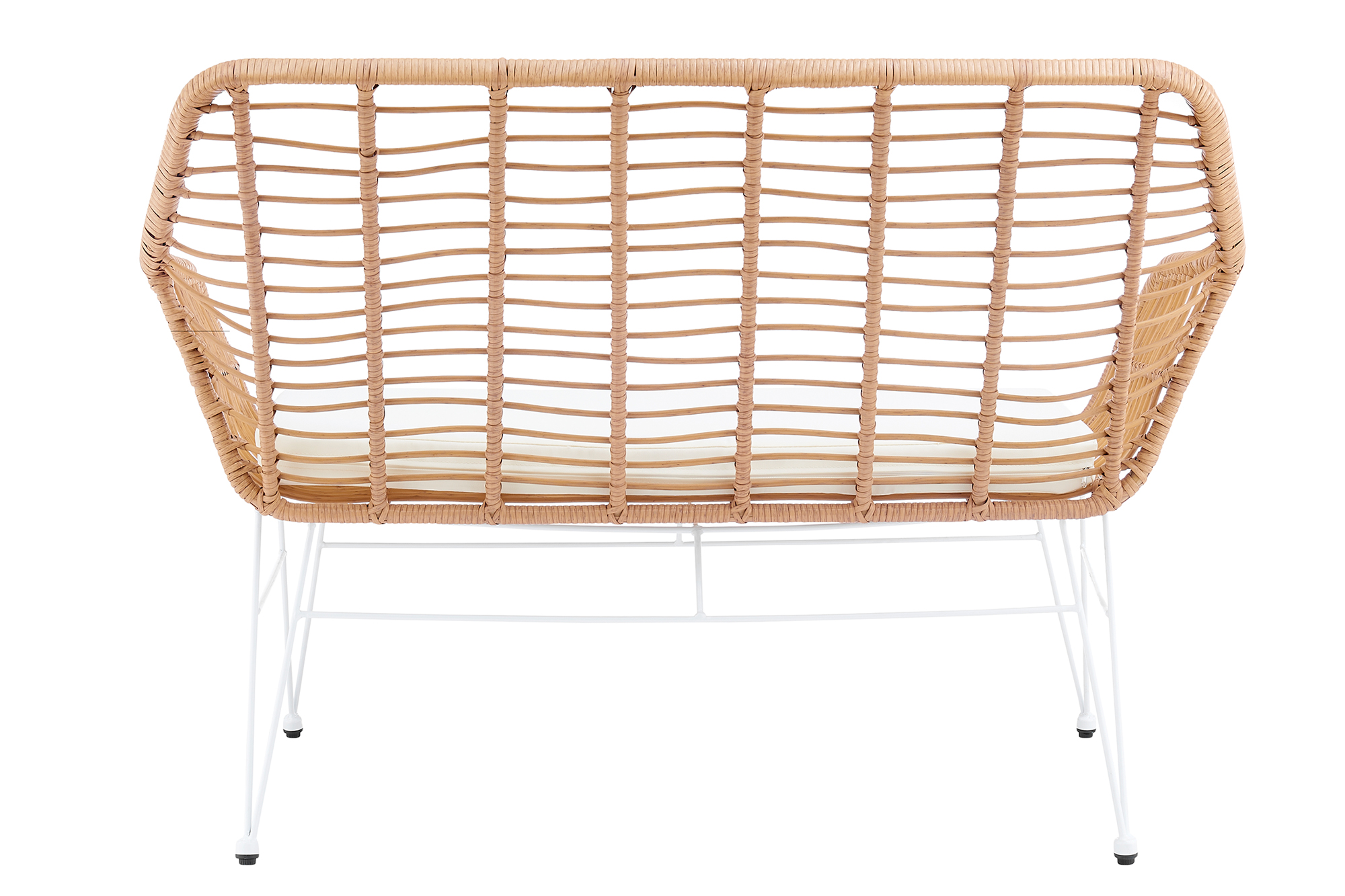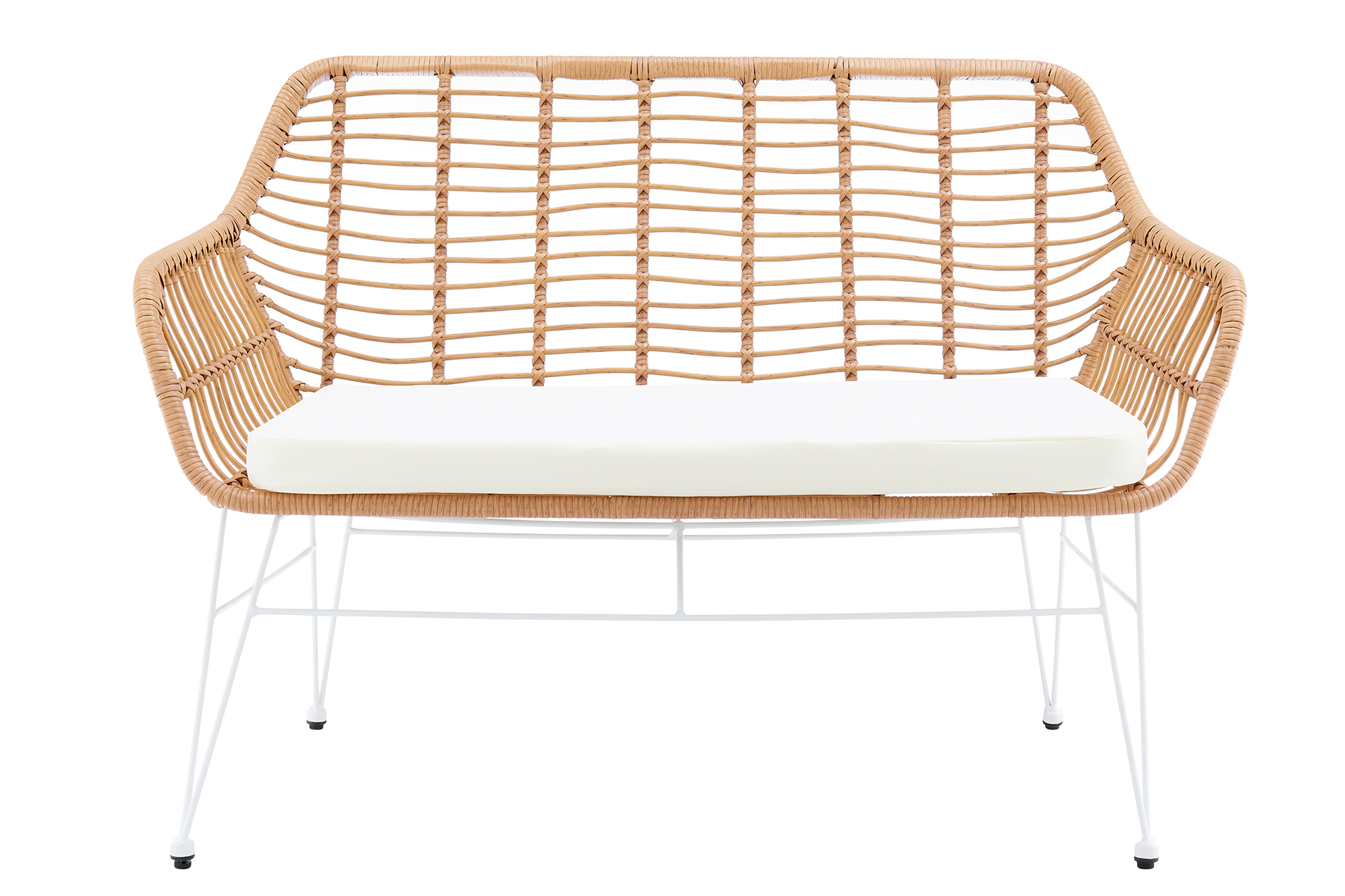 Die trendige Sitzbank besticht durch ihre Sitz- und Rückenfläche in Rattan-Optik natur und einem stabilen Metallgestell in Schwarz oder Weiß. Diese Sitzbank ist wetterfest und somit für den Indoor- und Outdoorbereich geeignet. Das massive Metall Gestell gewährleistet nicht nur einen stabilen Stand, sondern bietet auch einen wunderschönen Kontrast zur Rattan-Optik. Durch die bequeme Sitzschale, die aus 100% Polypropylen besteht, erhalten Sie einen angenehmen Sitzkomfort. Ein zusätzliches Sitzkissen in der Farbe schwarz rundet den Look ab. Ein Hauch Urlaubsfeeling für Ihren Wohn- oder Gartenbereich!