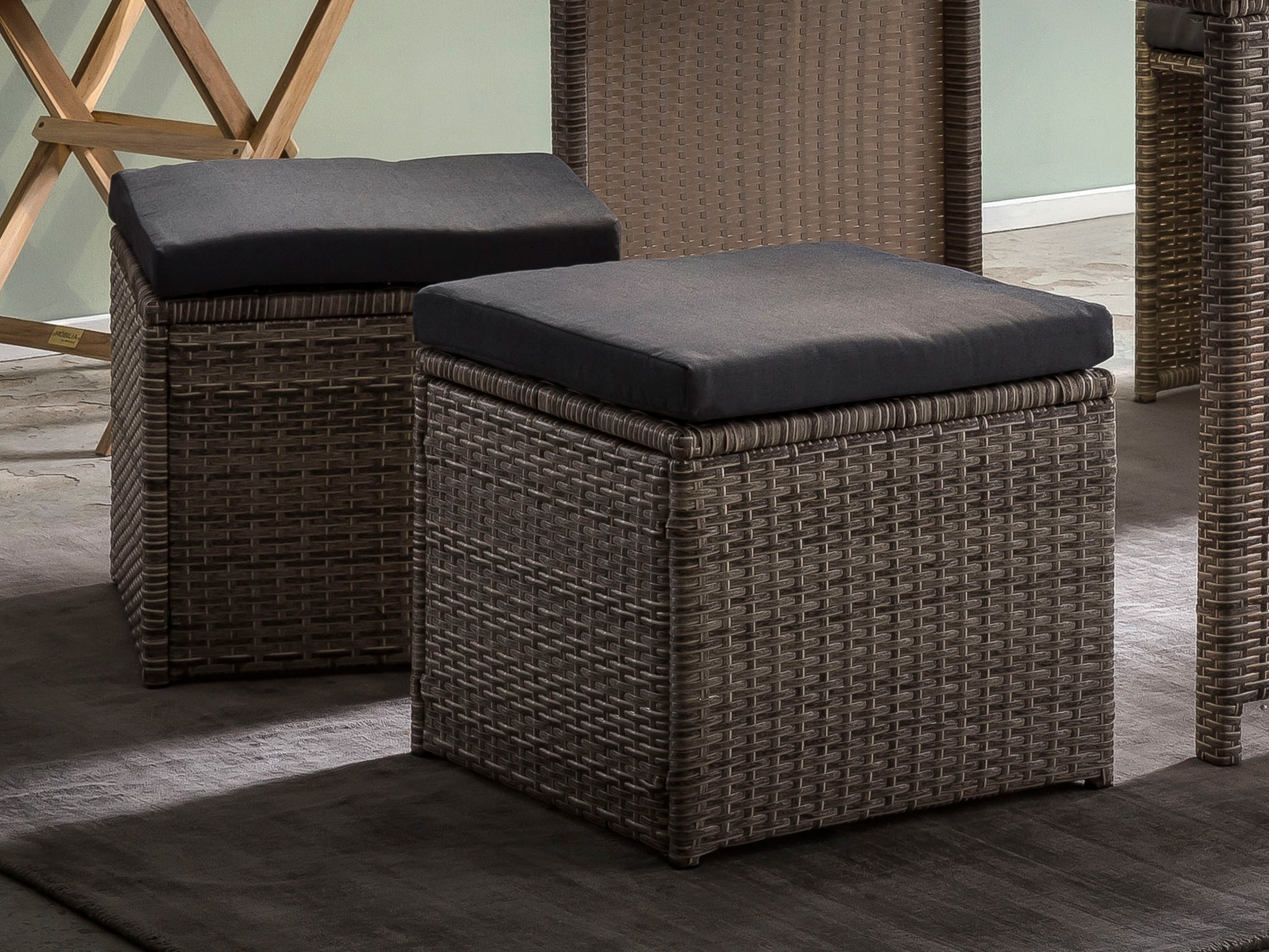 - 2 Stühle, 2 Hocker, 4 Sitzkissen, 2 Rückenkissen, 1 Tisch